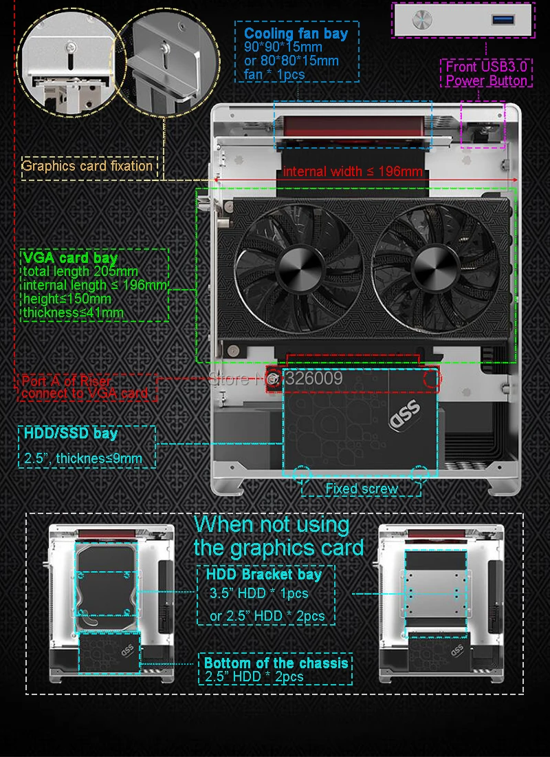 Hard Drive: 2.5" * 2 on the bottom, and 2.5" * 2 or 3.5" * 1 hard drives can be replaced with graphics bay.
