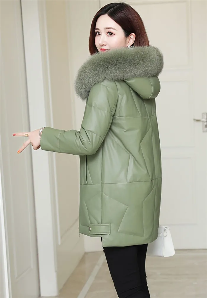 Отзывы о Куртка женская кожаная средней длины черная зеленая с большим меховым