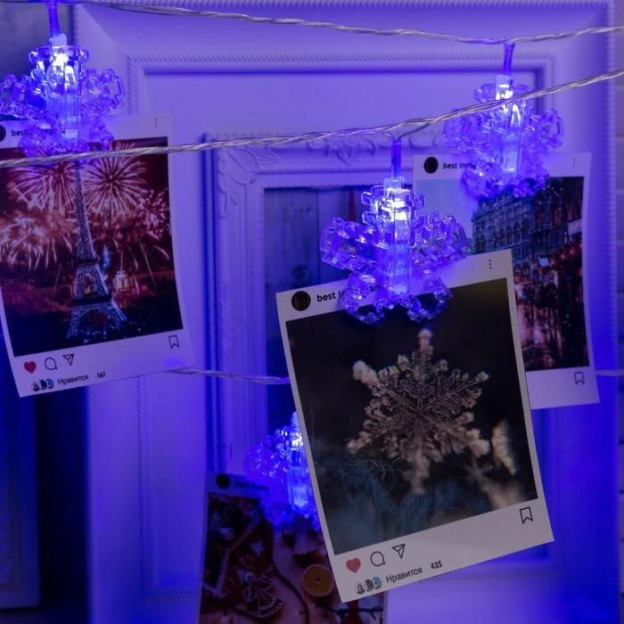 Гирлянда "Нить" 4.5 м с насадками "Прищепки-снежинки", IP20, прозрачная нить, 20 LED, свечение синее, фиксинг, 220 В