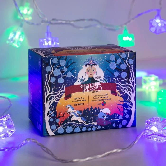 Гирлянда "Нить" 5 м с насадками "Кубики", IP20, прозрачная нить, 20 LED, свечение мульти, мигание, 220 В