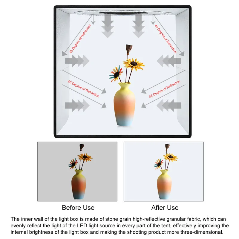 Внутренняя стенка светильник вого ящика изготовлена из зернистой каменной высокоотражающей гранулированной ткани, которая может равномерно отражать светильник светодиодный одного источника светильник в каждой части палатки, эффективно улучшая внутреннюю яркость светильник вого бокса и делая съемку более трехмерной.