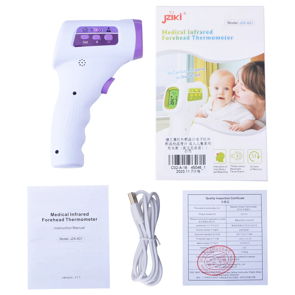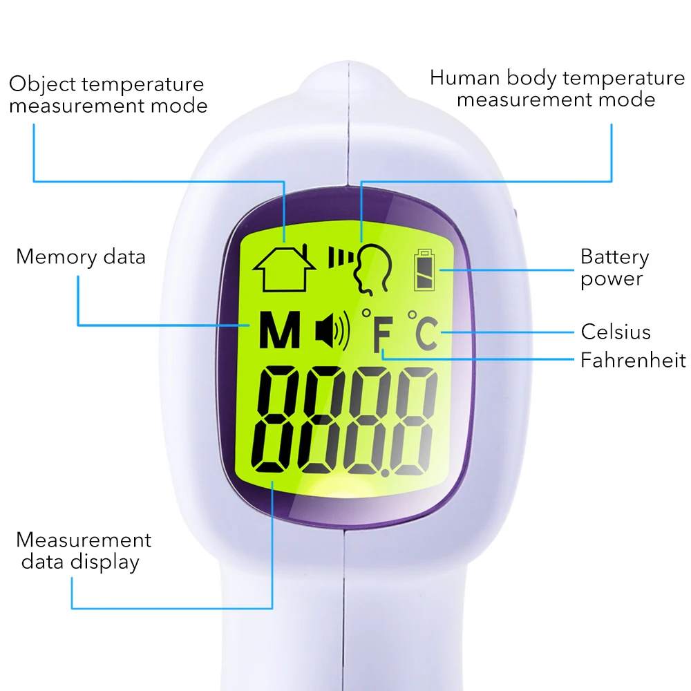 Особенности:* Этот инфракрасный термометр для лба подходит для всех возрастов, младенцев, взрослых и пожилых людей, что обеспечивает самый простой и практичный способ измерения температуры.* Термометр мгновенного считывания: нажмите кнопку измерения, и результат будет выложен в 1 секунду. Высокая эффективность, не нужно ждать, экономьте ваше время.* Сигнал тревоги высокой температуры: красная подсветка дисплея включена, отображается слово «HI» и будильник.Широкое применение: он не только поддерживает лоб людей, но также может случайно получить температуру поверхности объекта. Широко используется на заводе, в офисном здании, в торговом центре или дома.Характеристики:Цифровой термометр для лбаНазвание продукта: инфракрасный термометрЦвет: белыйРежим измерения: БесконтактныйМесто измерения: лобРасстояние измерения: 3-5 смДиапазон измерения тела: 32 ℃-42,9 ℃ (89,6 ℉-109,22 ℃)Точность измерения: 32,0 ℃-34,9 ℃ ± 0,3 ℃; 35,0 ℃-41,9 ℃ ± 0,2 ℃; 42,0 ℃-42,9 ℃ ± 0,3 ℃Единица измерения: ℃/℉Подсветка: зеленый: 32-37,1 ℃, желтый: 37,2-37,8 ℃, красный: 37,9-42,9 ℃Источник питания: 2 * батарейки типа "ААА" (не входит в комплект)Размер изделия: 150*80*40 ммУпаковочный лист:1 * Инфракрасный термометр1 * Руководство пользователя термометр (на английском языке)1 * Пальчиковый оксиметр1 * Руководство пользователя оксиметра пальца (на английском языке)