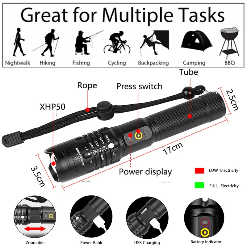Мощный светодиодный фонарик с использованием лампы XHP50 светодиодный Зарядка мобильного устройства и наличие самого устройства для хранения, которое эквивалентно смеси зарядного устройства и запасной батареи