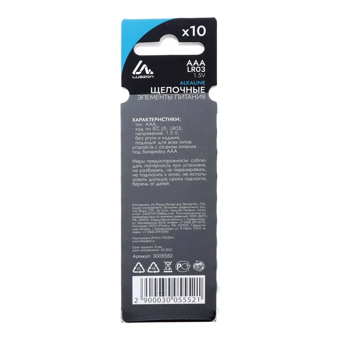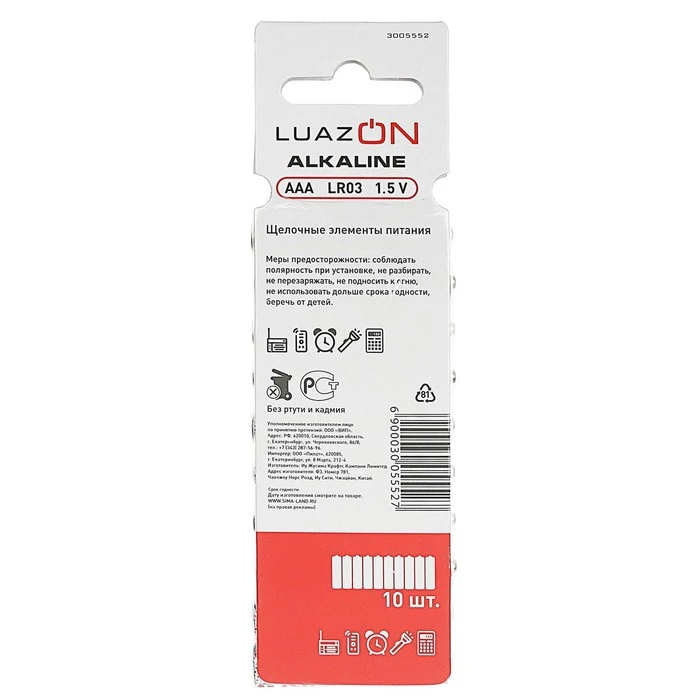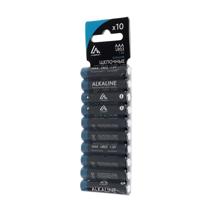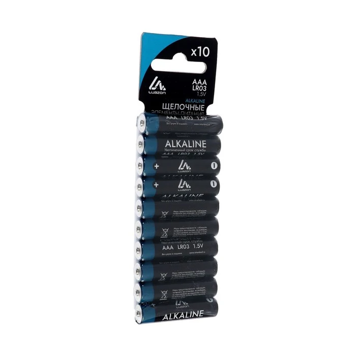 Набор алкалиновых батареек LuazON, тип AAA, LR03, 10 штук Преимущества алкалиновых батареек Алкалиновые (щелочные) батарейки обладают более высокой ёмкостью по сравнению с солевыми батареями, и хорошо подходят для использования с устройствами, которых потребляют много энергии. Широкий спектр применения Алкалиновая батарейка станет надежным источником питания для часто используемых устройств, нуждающихся в дополнительной мощности. Они используются во многих портативных устройствах: пульт, радиоуправляемые игрушки, фонарики, радиоприемники и другие. Надежность и безопасность хранения Батареи не протекают и долго сохраняют заряд. Так как они не содержат ртуть и кадмий, то абсолютно безопасны для здоровья. Удобная упаковка В набор входит 10 батареек. Они упакованы в блистер, упрощающий их хранение и транспортировку. Дизайн Характеристики