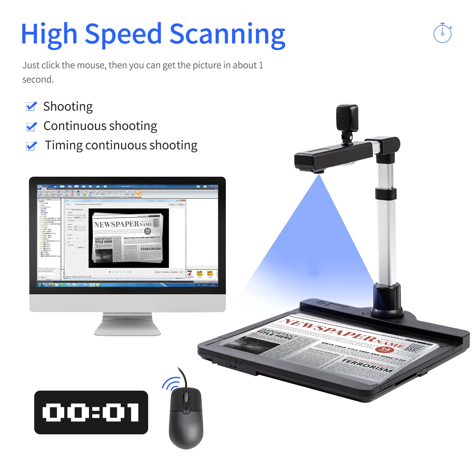 【Высокоскоростной сканер 】:Просто нажмите на мышь, затем вы можете получить изображение примерно за 1 секунду, очень эффективно. Высота сканера регулируется, и размер сканирования до A3. Поддержка съемки/непрерывной съемки.