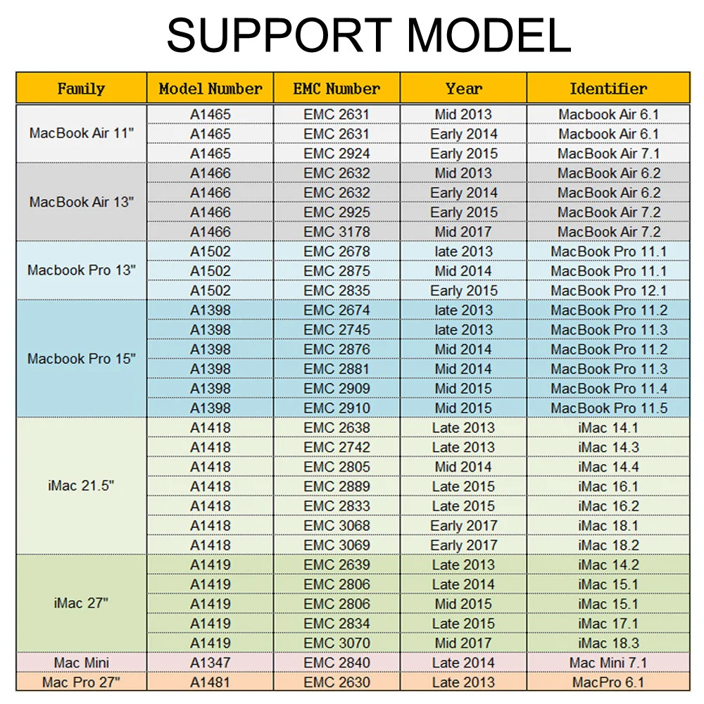 Для iMac: 21,5 Дюймов: 2012-2018 iMac13,1 iMac14,1 iMac14,3 iMac16,1 iMac16,2 iMac18,1; 27 дюймов: 2012-2018 iMac13,2 iMac14,2 iMac17,1 iMac18,3. Для Mac mini: 2014 Macmini7,1. Для Mac Pro: 2013 MacPro6,1
