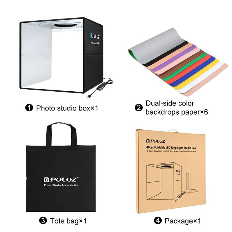 Портативный складной световой короб PULUZ 40 см * 40 см с регулируемой яркостью, цветовая температура 3200-6500k, кольцевой световой короб, USB, бокс для фотостудии, палатка для съемки с 6 двухсторонними цветными фонами