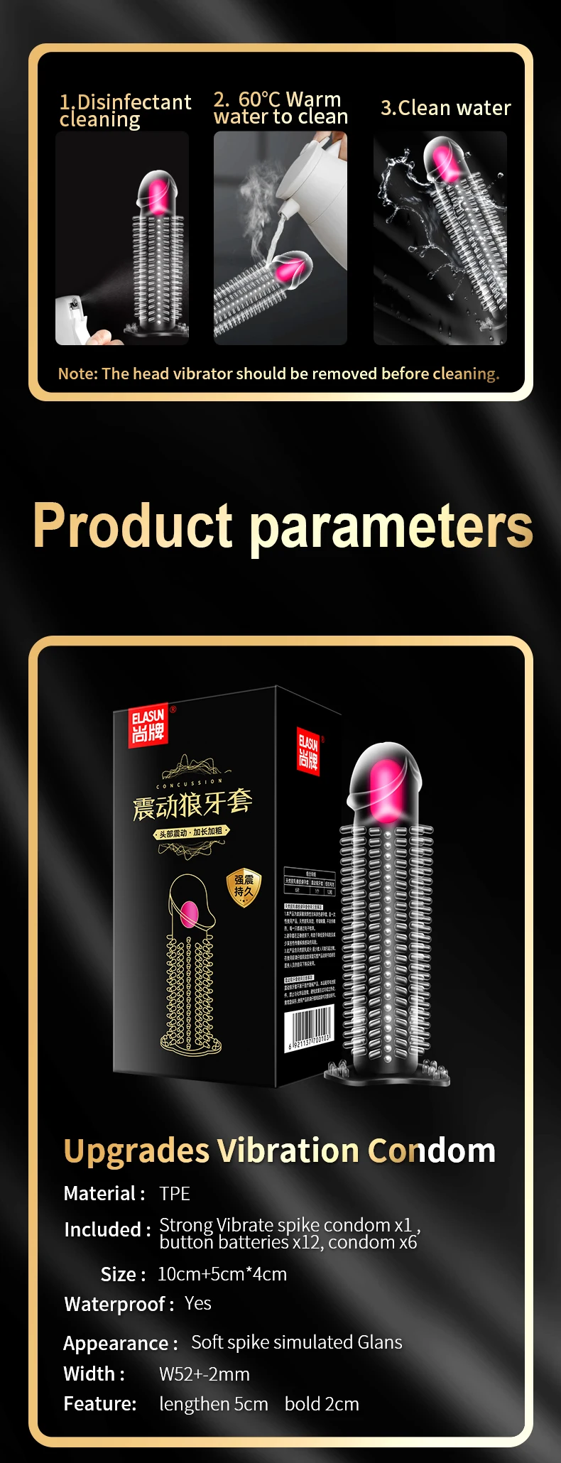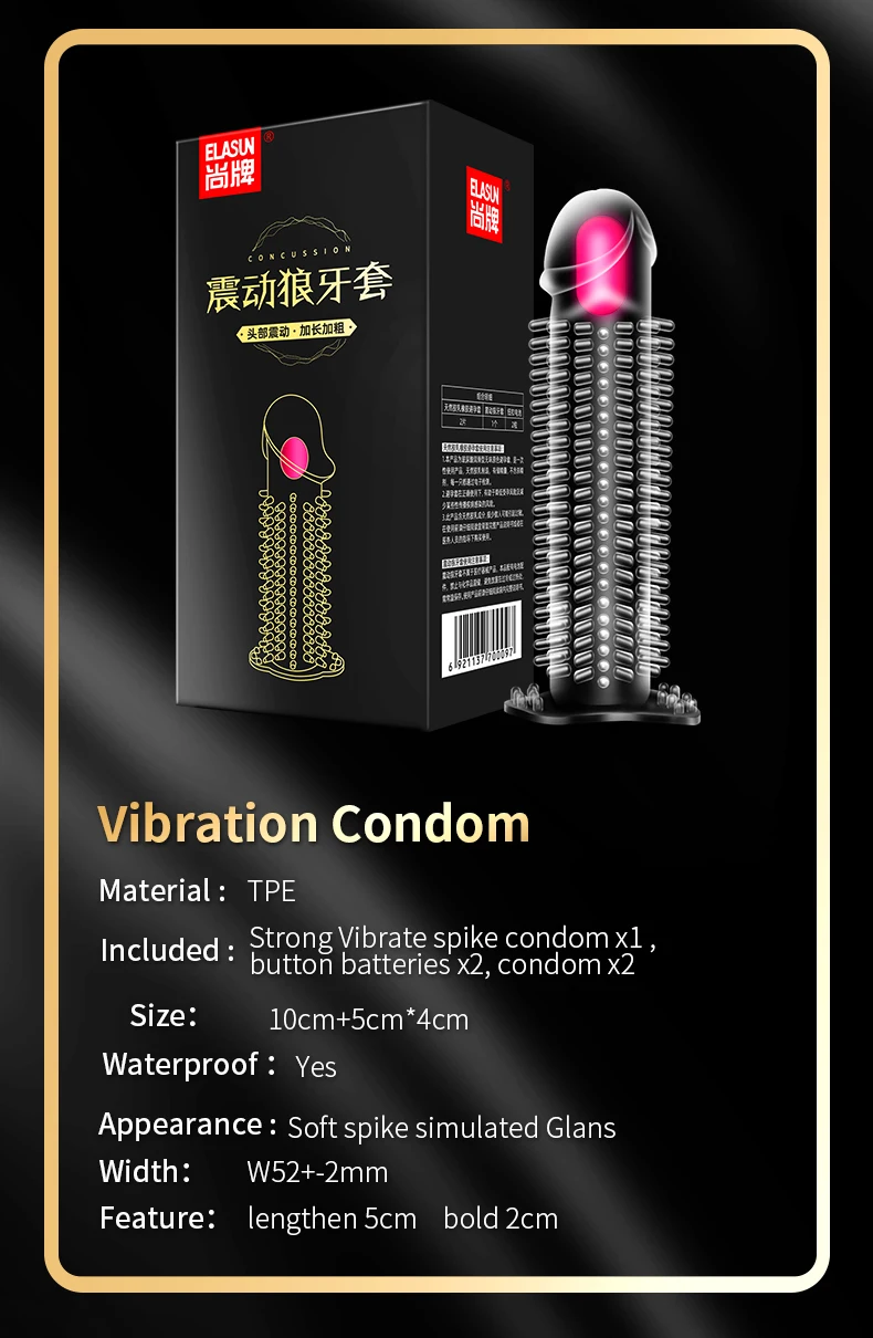 Информация о продукции: 1.МногоразовыеВибрирующийПрезервативы 2.Вагинальная стимуляция 3.Длина 5 см 4. Достаточно Смазывается Бренд: Elasun Материал: NАтуральный латекс Ширина: 52 мм ± 2 мм Длина: ≥ 160 мм Тип: Спайк Обновленная версия: В комплекте: вибрированный презерватив с шипами x1, кнопочные аккумуляторы x12, презерватив x6 Обычная версия: В комплекте: вибрированный презерватив с шипами x1, батарейки с кнопками x2, презерватив x2(Зависит от вашего выбора)