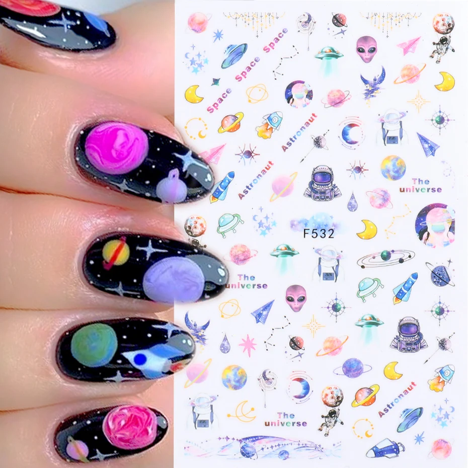 Звездные космические наклейки для ногтей Galaxy Alien ET Planet дизайн ногтей Скульптура абстрактный цветок лист слайдер аксессуары для маникюра