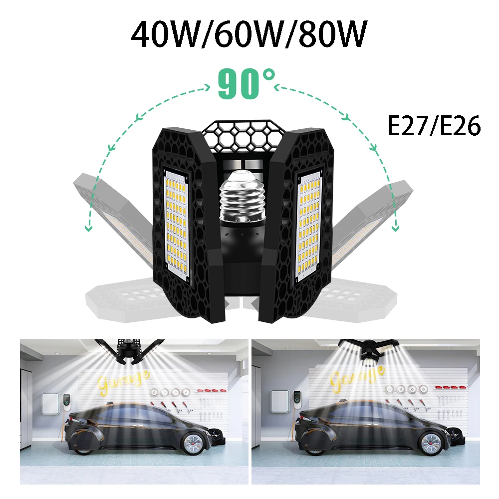 - Deformable Ceiling Light - LED garage lighting with a unique adjustable wide-angle design, each wing 90 degree adjustable, which can have a perfect garage lighting distribution curve according to your application, this will make the light cover 360°area. Just Perfect for garage, workshop, warehouse, basement, auto shops,carports office,shopping mail, workshop, anywhere need bright light.
