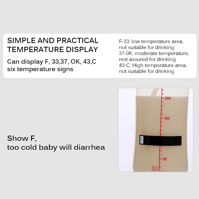 Термометр для бутылок с молоком разработан с большим ЖК-экраном, который легко читается. Кроме того, его задняя наклейка позволяет удобно устанавливать термометр для бутылок с молоком.