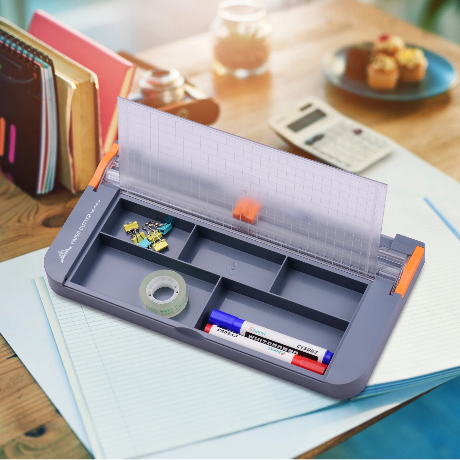 Multi-Functional: Paper trimmer with 5grid 2-size storage case can hold scissors, highlighter, paper clip, eraser, etc.