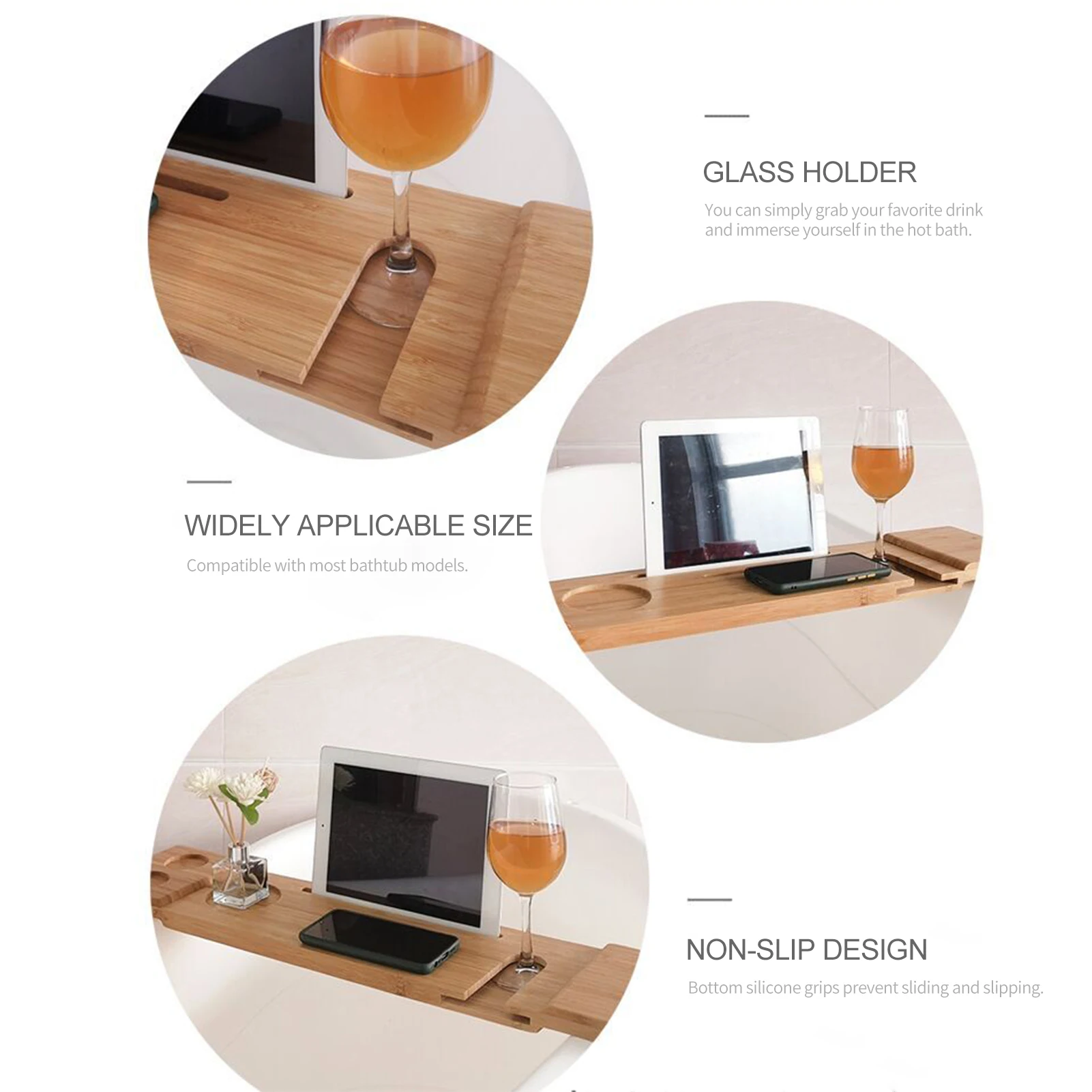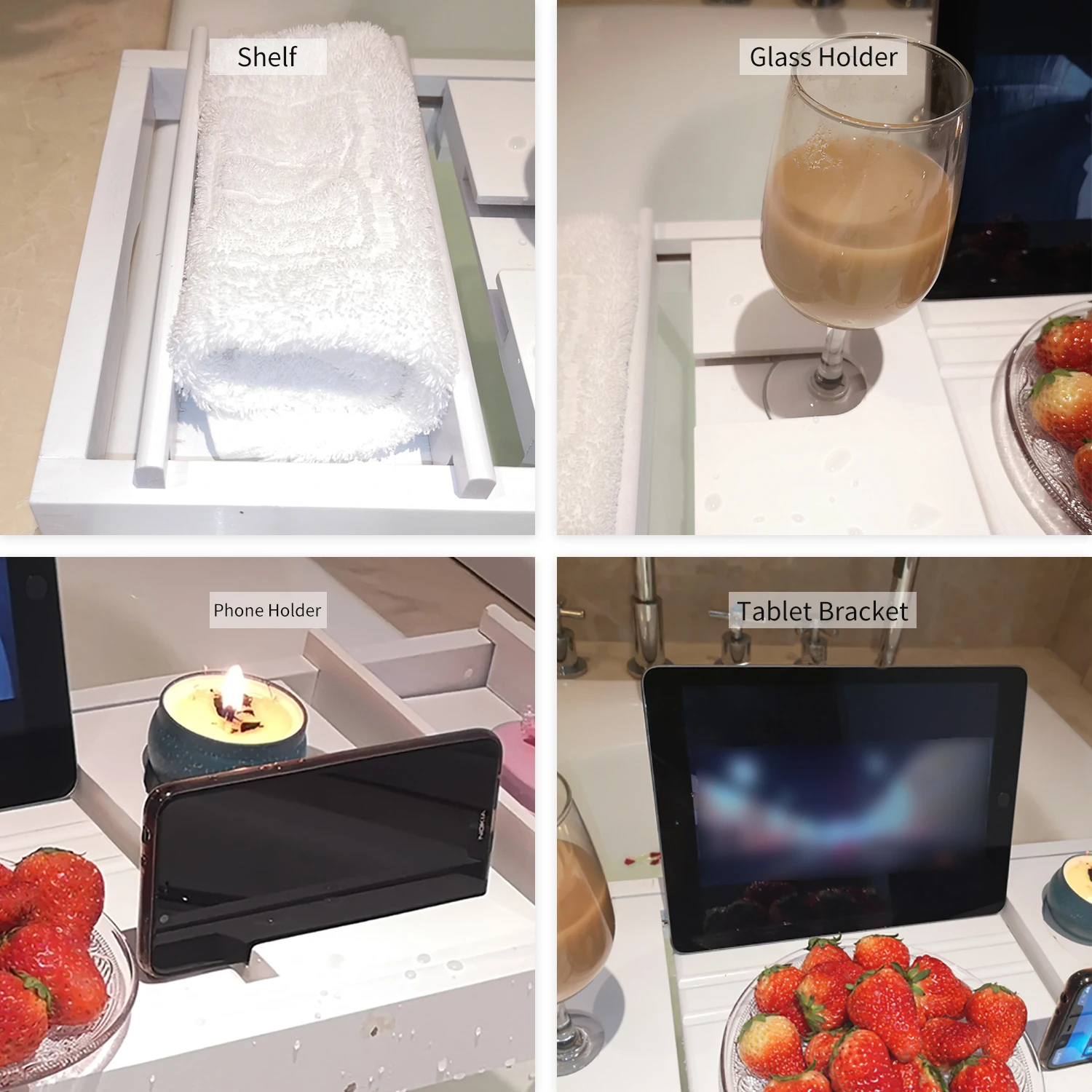[Большое хранилище]Лоток caddy с тремя дополнительными слотами для хранения вашего телефона, бокала для вина и винных бутылок. Две подвижные полки могут держать ваши книги, чашки, свечи, полотенце и т. Д.