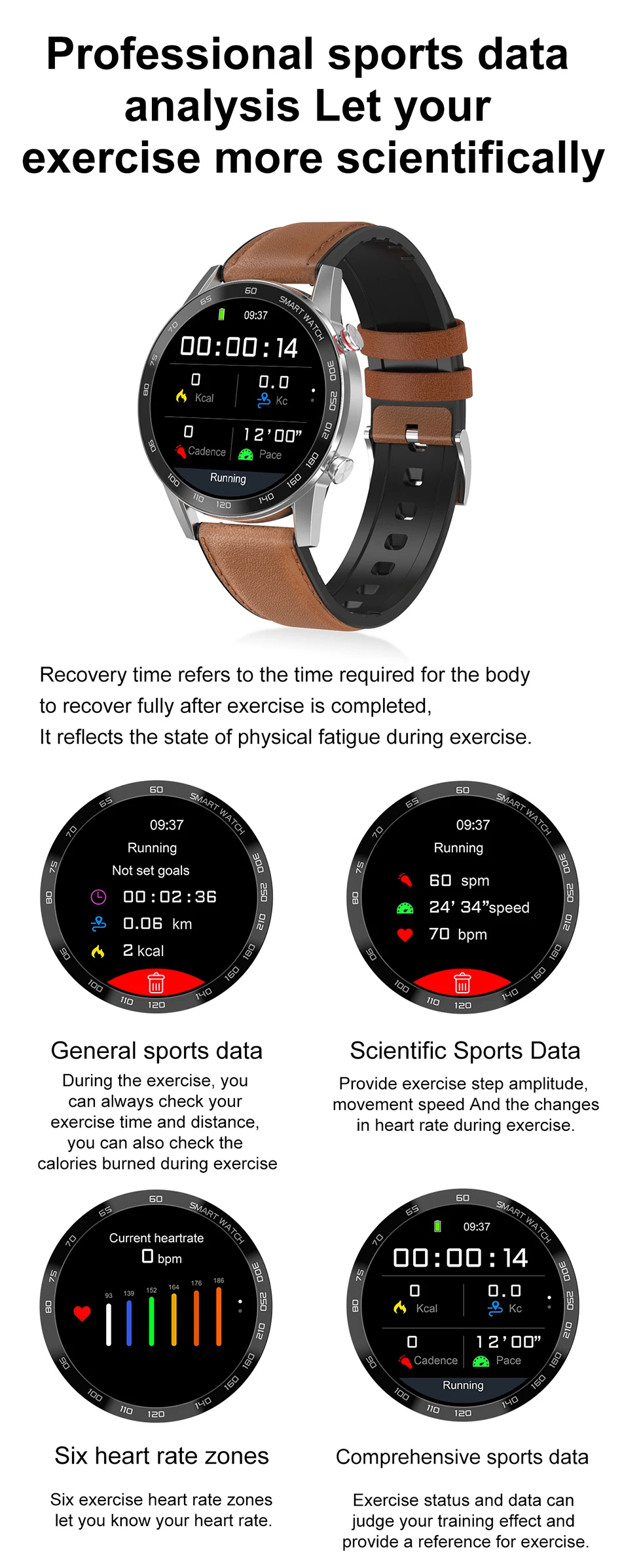 Время восстановления относится к времени, необходимому организму для полного восстановления после завершения упражнений, это отражает состояние физической усталости во время упражнений. Общие спортивные данные Во время тренировки вы всегда можете проверить время и расстояние тренировки, а также сожженные калории во время тренировок Научные спортивные данные Обеспечьте амплитуду шага тренировки, скорость движения и изменения частоты сердечных сокращений во время тренировок. Шесть зон сердечного ритма Шесть зон сердечного ритма позволят вам узнать свой пульс Полные спортивные данные Состояние упражнений и данные могут оценить ваш эффект тренировки и дать рекомендации для упражнений.