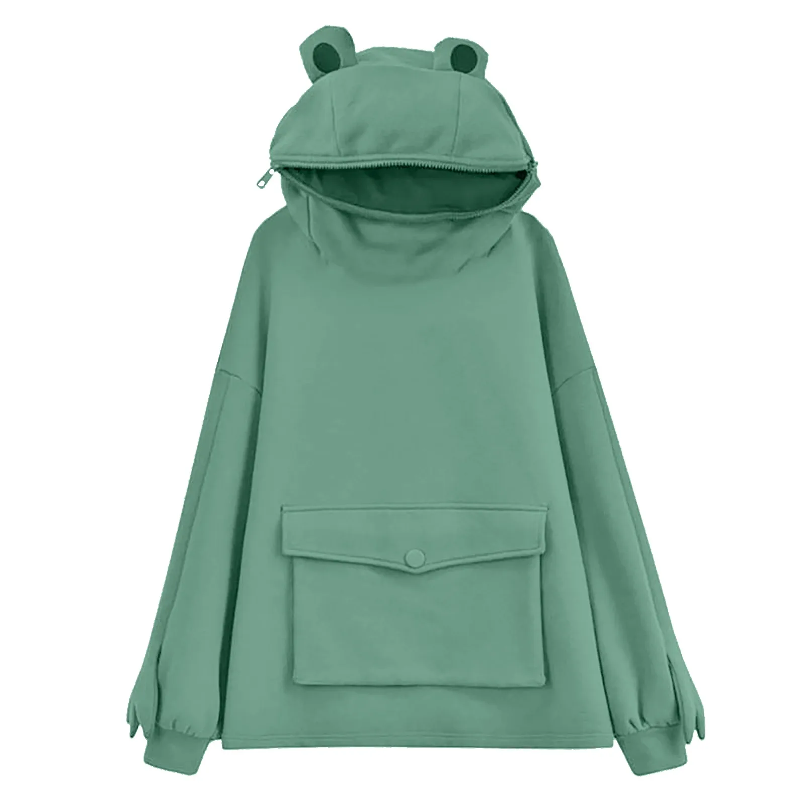 Осенне-зимний женский пуловер с длинными рукавами и трехмерной строчкой, милый дизайн лягушек, свитер с карманами, балахон F4