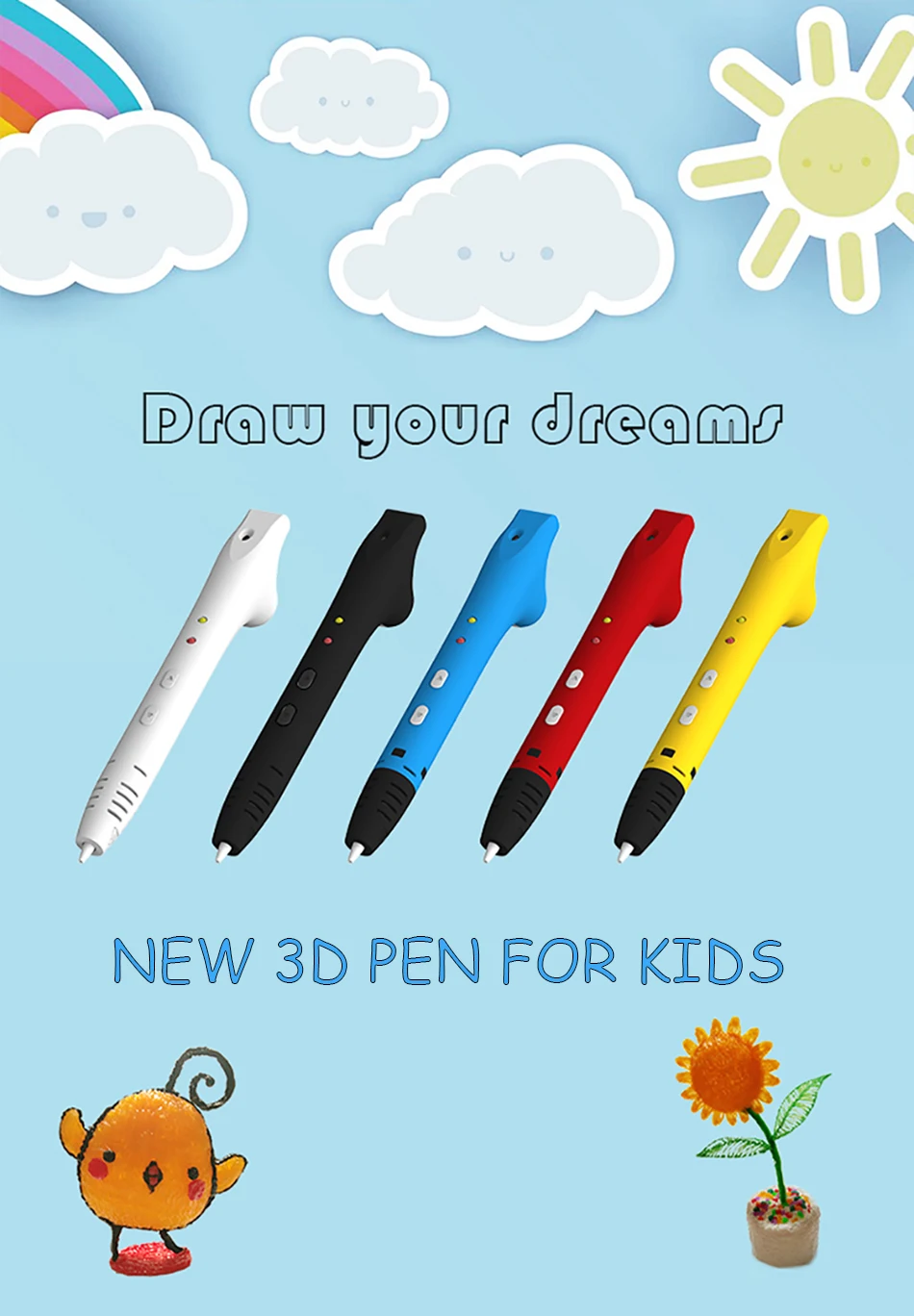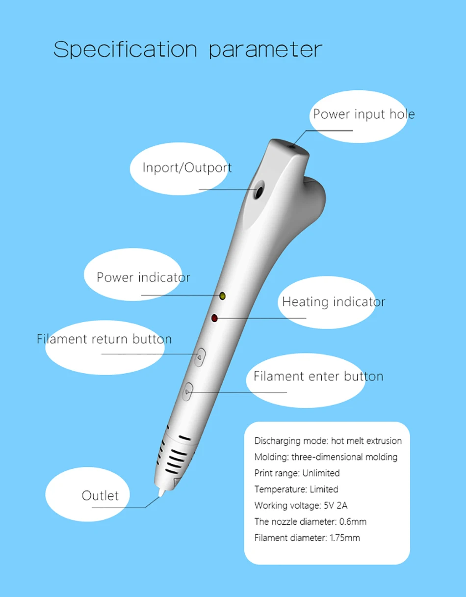 -Воспитывают детскую концентрацию внимания, практические способности, идеологическую способность и творческие способности. -Прост в эксплуатации, управление двумя клавишами, предназначен для детей. -Низкотемпературный Тип 3D pen, температура наконечника ручки максимально низкая до 40 по Цельсию, она безопасна для использования детьми; -Ультра тонкая и светильник 3D Ручка это, дизайн дуги, которая подходит по форме руки, удобно держать. -PCL-экологически чистый, без запаха и безопасный материал. -Вы можете подключить ручку к DC5V-2A портативной мощности, позволяет рисовать в любом месте. -Функция автосна после завершения вывода нити или 2 минуты без работы, это безопаснее и Энергосберегающе; -В процессе покраски 3D Ручка поддерживает переключение на автоматическую загрузку/разгрузку материалов или мануальную погрузку/разгрузку материалов; -Посылка включает в себя 20 цветов 100 метров PLA или PCL нити.