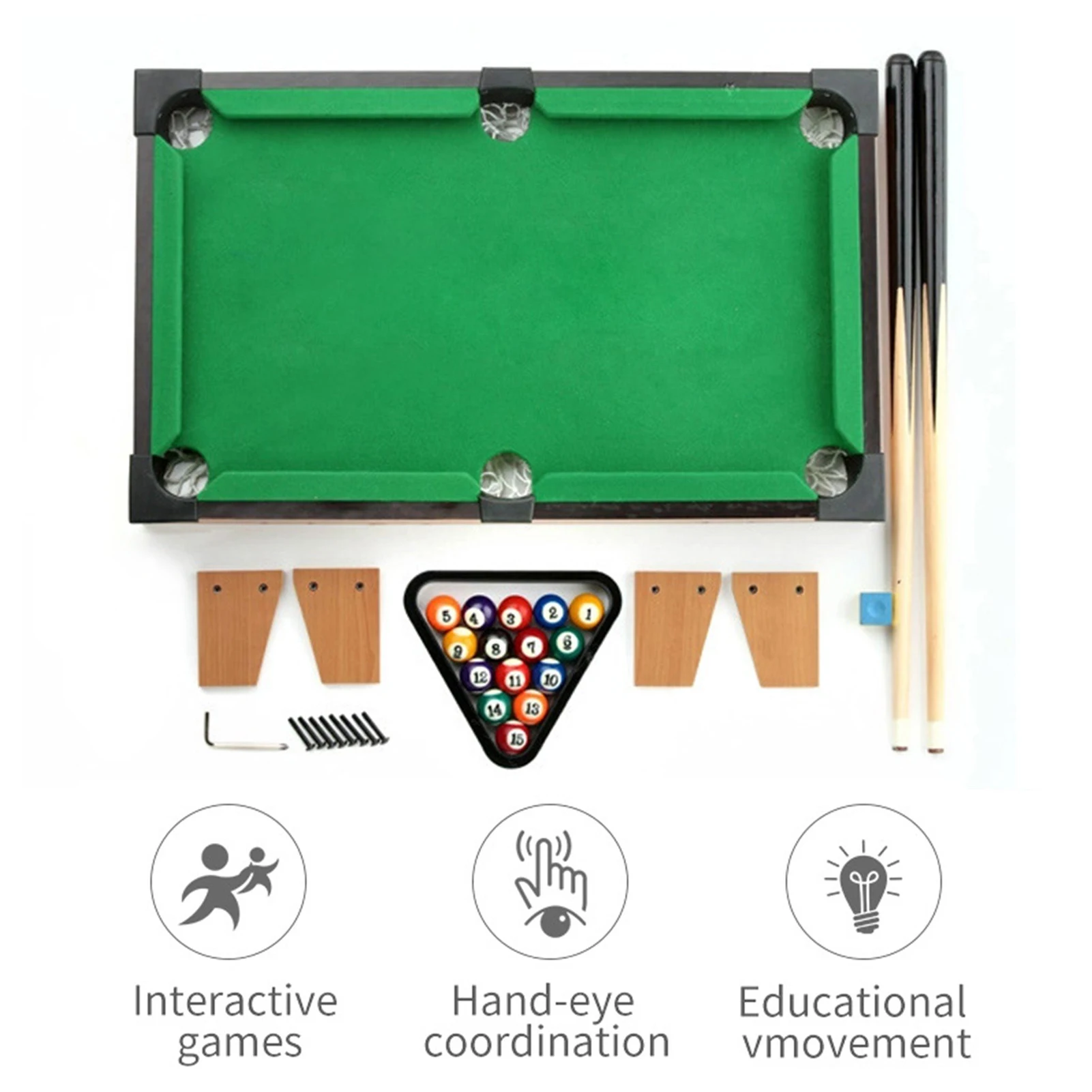Точки пули:1. Маленький и портативный: Этот портативный миниатюрный бильярдный стол-идеальный компактный размер и идеально подходит для мест, где нет места для полноразмерного бильярдного стола, например, детская игровая комната или семейная комната.