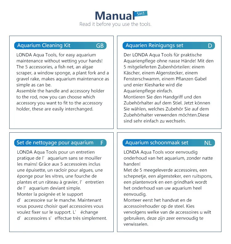 modname=ckeditor Feature: 100% Brand new and high quality Practical and durable home using product Easy to install and use. Easy aquarium maintenance without wetting your hands. The 5 accessories, a fish net,an algae scraper, a window sponge,a plant fork and a gravel rake, make aquarium maintenance as simple as can be. Assemble the handle and accessory holder to the rod, now you can choose which accessory you want to fit to the accessory holder, these are easily interchangeable. Remove the dirty things from the bottom of your aquarium effectively. Color: Black and Blue (as the picture showed) Size: around52~60cm(including the functional head) Package content: 1 pcs cleaning tool