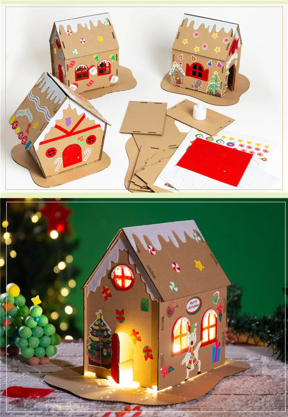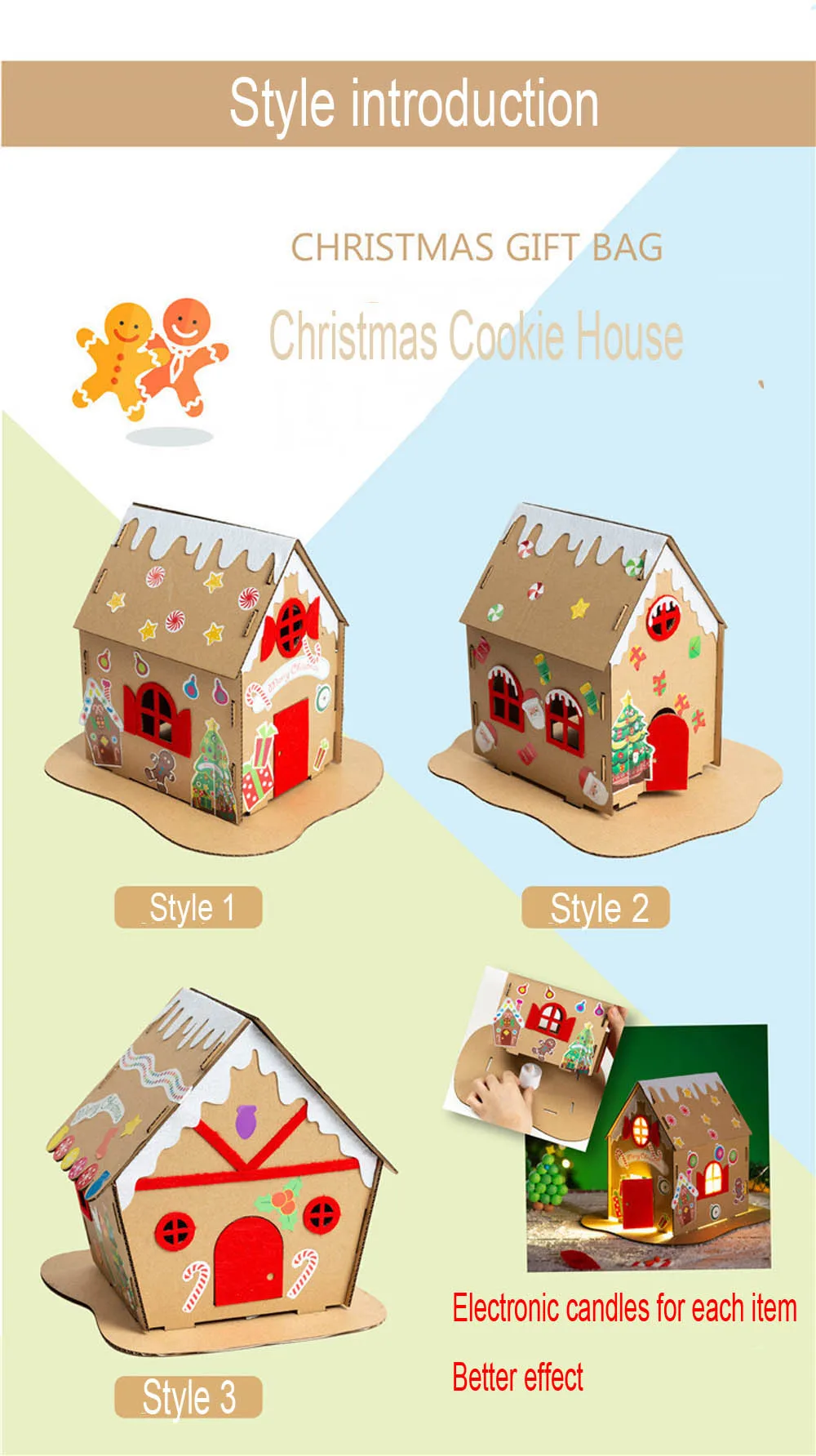 Name: Christmas Cookie House Type: Handmade material bag Material: paper Size: 20*20*20cm Material list: 1*Electronic candle 1*Adhesive non-woven accessories 1*color pattern sticker 1*kraft paper house ,