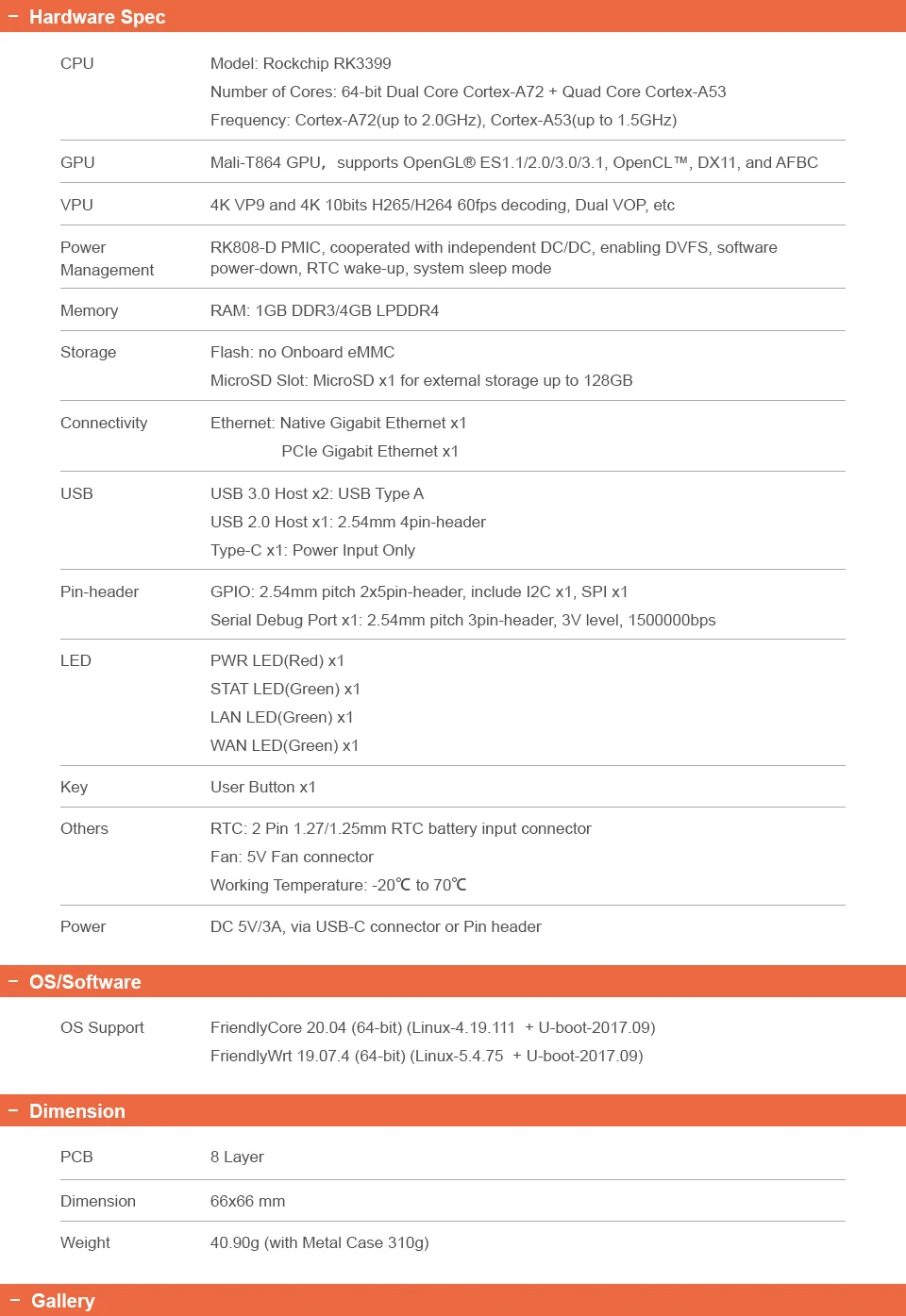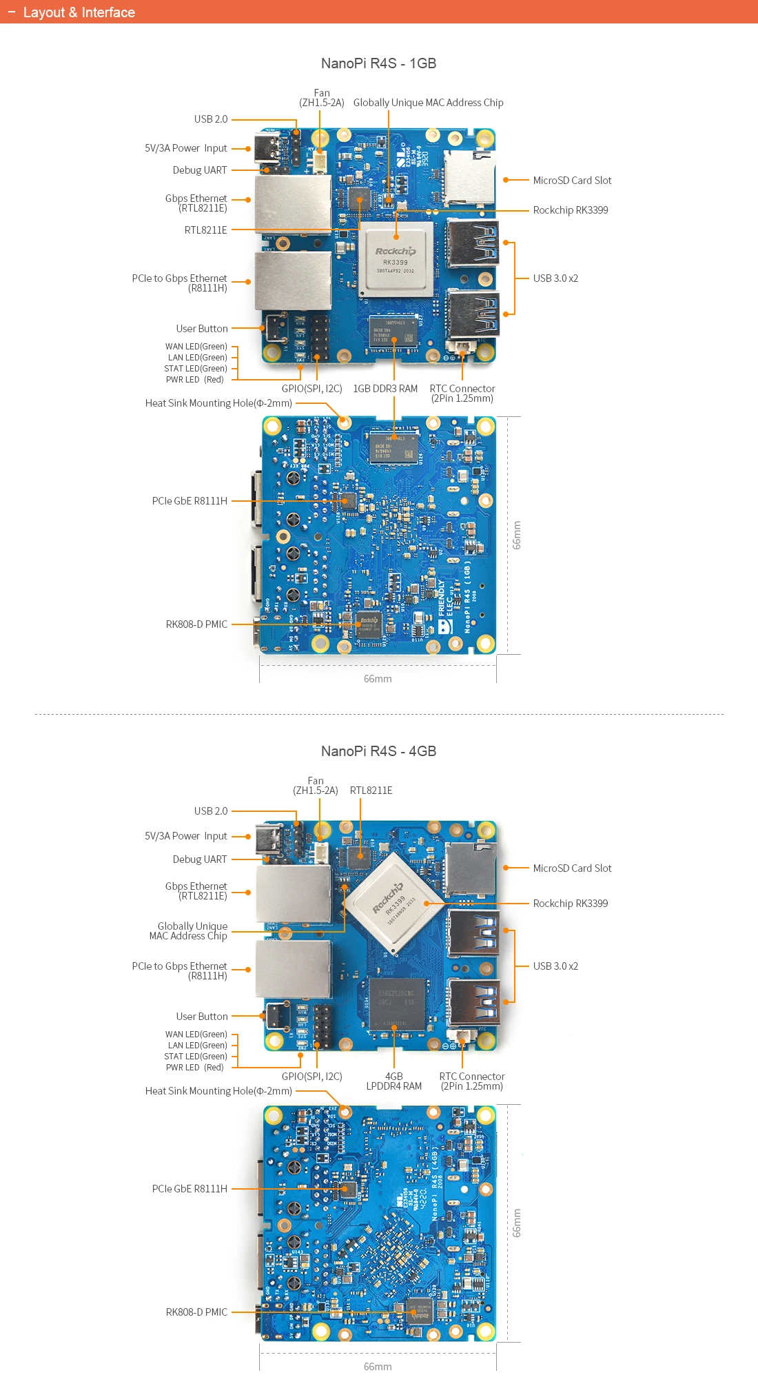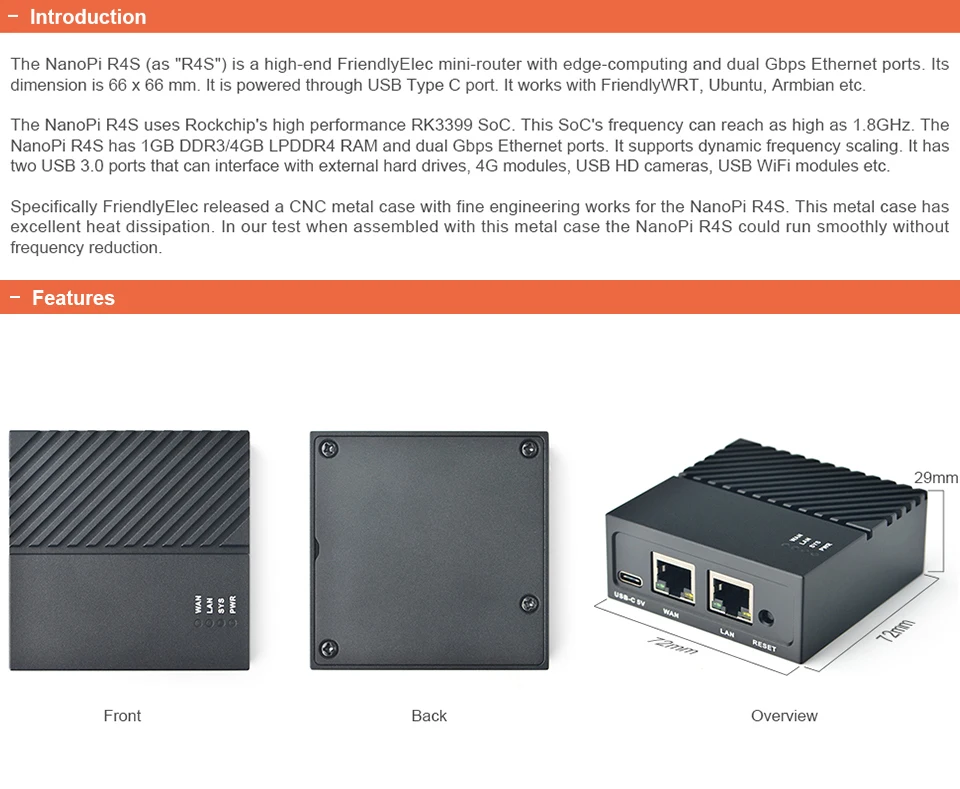 NanoPi R4S использует RK3399 SoC. Он имеет два Гбит/с Ethernet порта и 1G/4G DDR4 оперативной памяти. FriendlyElec омов в система для него. Он работает с Docker CE. Это хороший платформой для разработки приложений IoT, NAS приложений, система автоматического управления "умный дом" ворота и т. д.