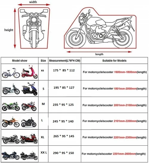 Экслюсивная Крышка для ваших мотоциклов 100 Сделано в Турции Водонепроницаемый Защищает ваш мотоцикл от царапин Не потеет Защищает краску вашего мотоцикла Защита от пыли 4 сезона использования С сумкой для переноски Защищает от ультрафиолетовых лучей Полностью блокирует ультрафиолетовые лучи от солнца, которые повреждают поверхность и интерьер транспортного средства. Защищает от всех пылевых элементов Уменьшает и защищает от природных загрязняющих веществ, падений животных, Сап деревьев, промышленных загрязняющих веществ, пыли в воздухе и грязи. Мягкая ткань против царапин Наша ткань очень гладкая, устойчивая к истиранию, безопасная и мягкая для лакокрасочного покрытия. Эластичный низ Эластичный низ спереди и сзади. Ремешок с зажимом под корпусом Слева направо под ремешком помогает удерживать крышку в ветреную погоду. Он изготовлен из того же материала покрытия, который не царапает краску. Подходит для 4 сезонов Вы можете легко использовать его для защиты вашего автомобиля от любых погодных условий. Водонепроницаемость и защита от пыли, вы можете использовать его-от 40 до + 60 градусов погодные условия без цвета. Он защищает ваш автомобиль от перьев птиц, пыли, пыльцы и подобных внешних факторов. Кроме того, воздушный и пыльцевый фильтр вашего автомобиля будет более длительным. Важно Используйте крышку после того, как вы очистите и высушите свой мотоцикл. Если вы используете крышку или аналогичные продукты на вашем мотоцикле без очистки, пыль или muds может поцарапать Ваш мотоцикл. Каждый раз, после использования чехла, начинайте обертывать крышку от передней до задней стороны вашего мотоцикла. Не используйте чехол для мотоцикла на новом окрашенном мотоцикле в первые 3 месяца. В дождливую погоду перед тем, как покрыть ваш мотоцикл, убедитесь, что ваш автомобиль сухой, и если его мокрый не покрывает ваш мотоцикл. Если вы используете крышку мотоцикла часто лучше мыть крышку мотоцикла каждые 3-4 месяца, что продлит срок его службы.