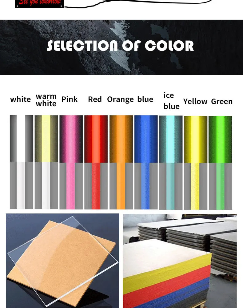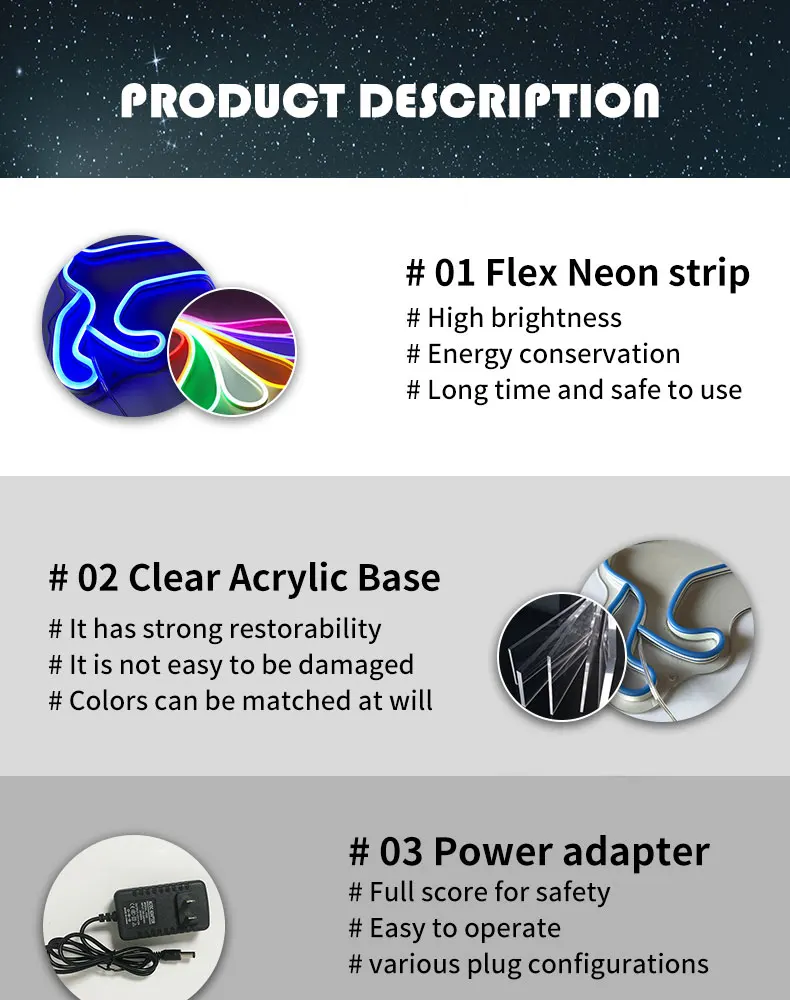 1. Акрил: обладает хорошей прочностью, светильник весом, долговечностью, не легко повредить, прозрачные материалы делают неоновый светильник s более красивым