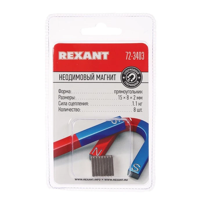 Неодимовый магнит REXANT, прямоугольник 15х8х2 мм, сцепление 1.1 кг, 8 шт. 4370889