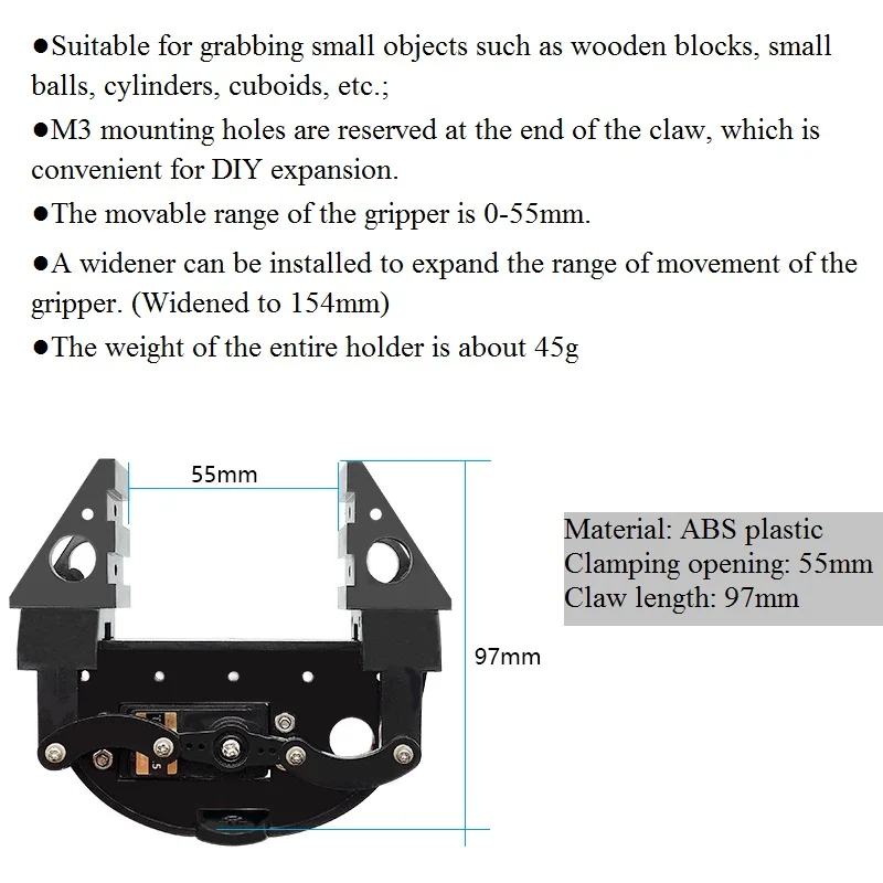 Материал: алюминиевый сплавВес: 0,82 кг (включая вес рулевого механизма)Цвет: черный, серебристыйСервопривод дополнительно: MG996rХарактеристики: основание манипулятора может вращаться на 360 градусов.