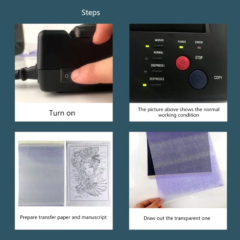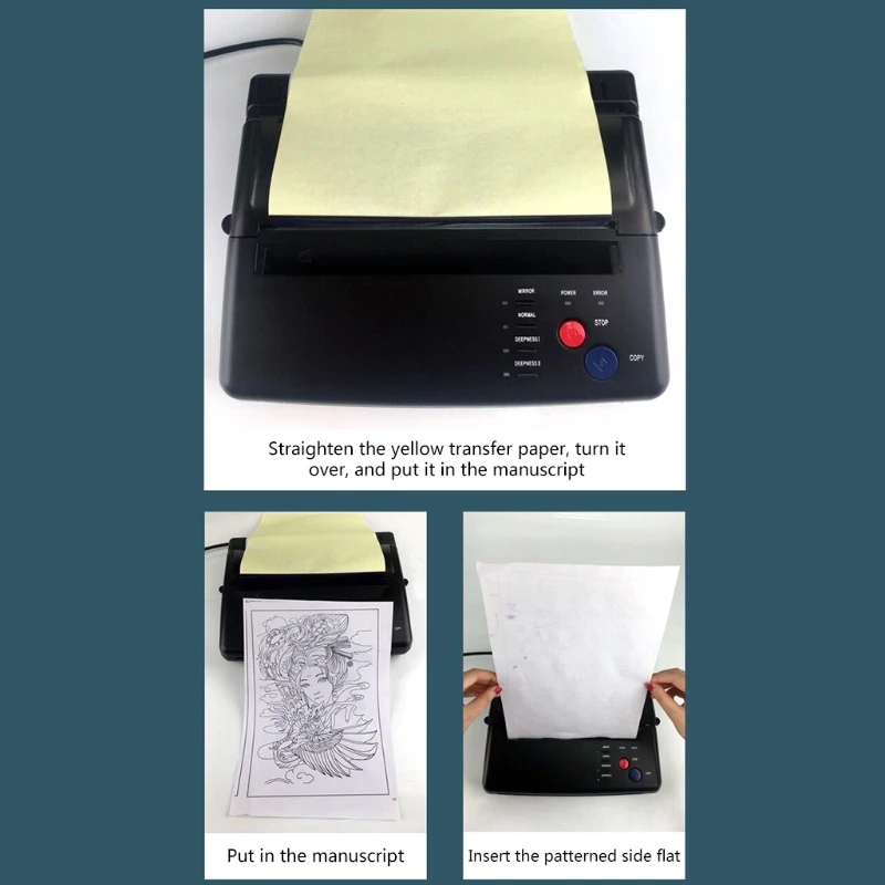 Машина для переноса татуировок позволяет художникам-татуировщикам или профессионалам быстро и эффективно копировать дизайн на шаблон бумаги в несколько простых шагов.