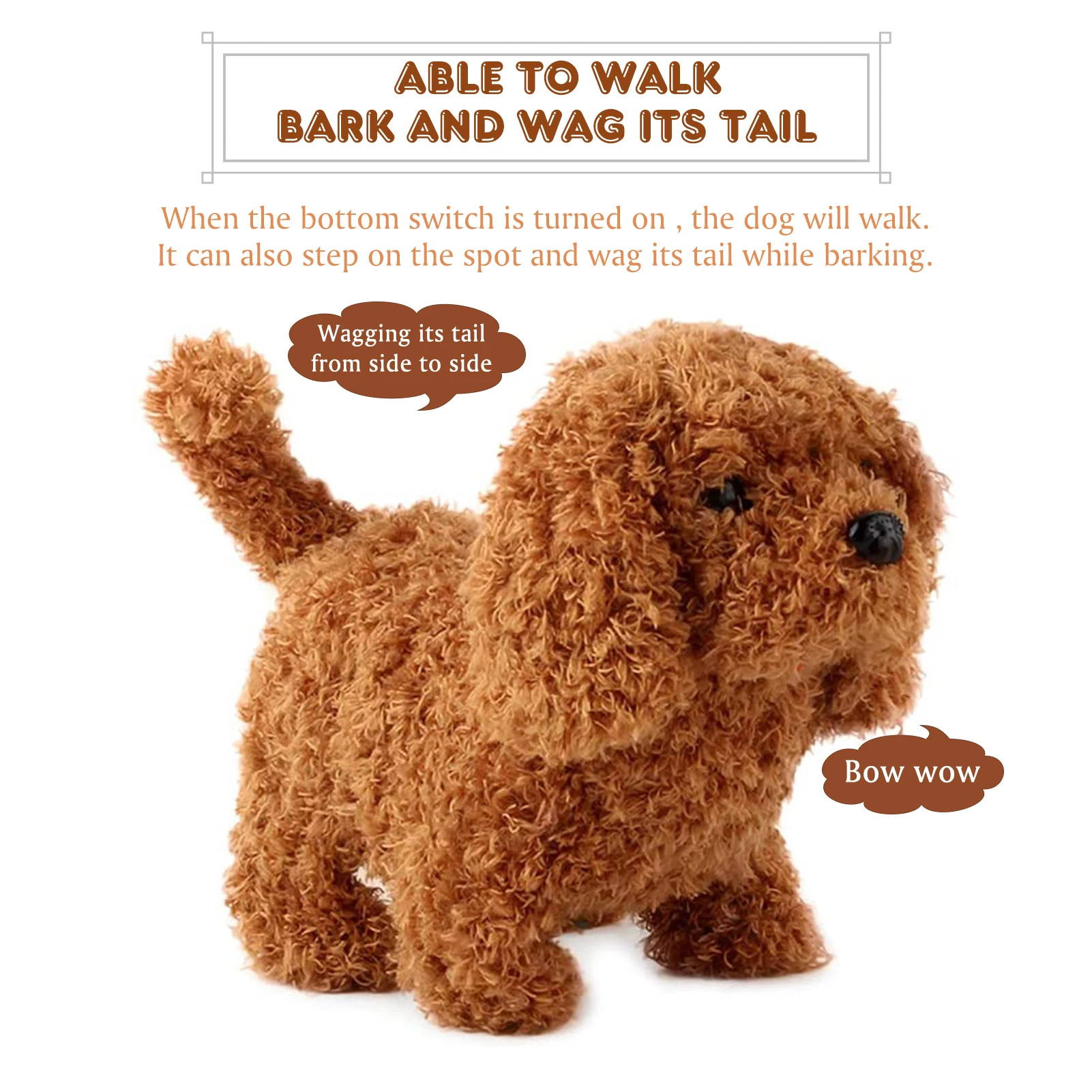 Эта электрическая плюшевая собака может лаять, ходить и пробежать хвосты, как настоящая собака. Эта очаровательная собака может помочь детям, взрослым и собакам убить время. Даже оставаясь дома один, жизнь не более скучна для вас вместе с собакой.