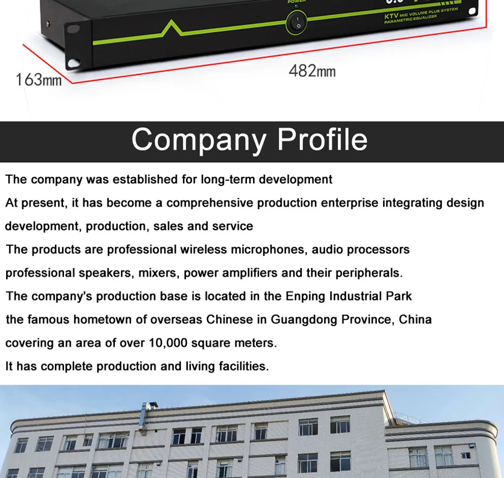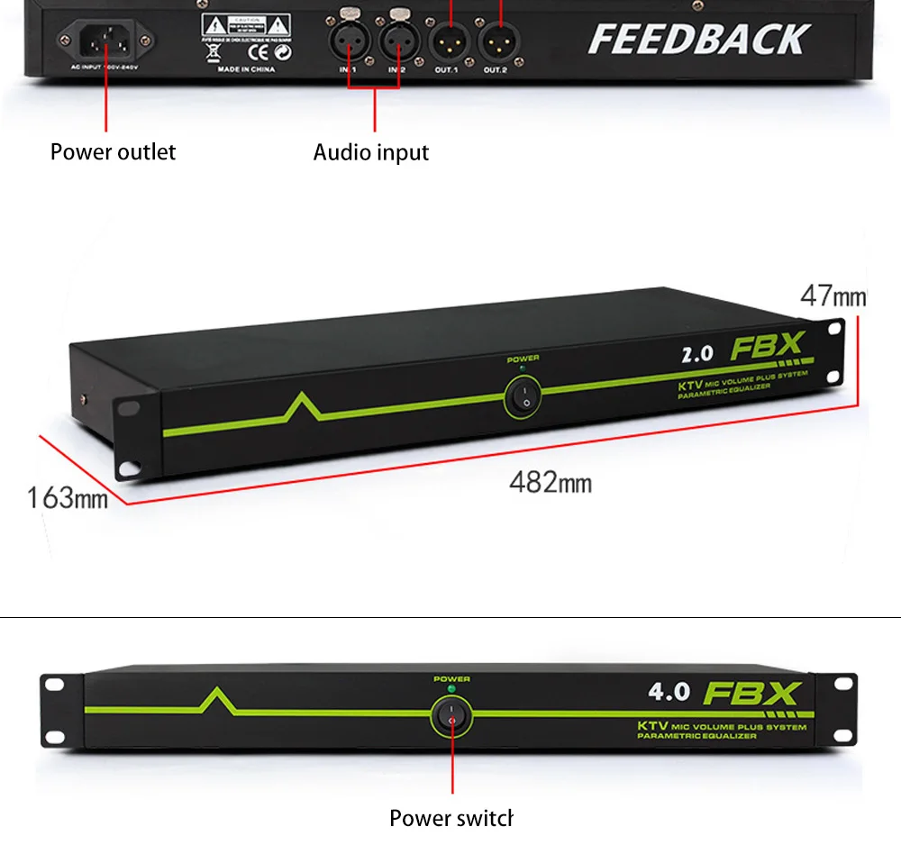 Тип: один ключ анти-воет отзывы suppressor Мощность Режим питания: переменный ток 110V-230V переменного тока, 50/60 Гц Опции входного и выходного микрофона: MIC-2 в 2 out/MIC-4 в 4 out/MIC-6 в 6 out Частота переключения: 5 Гц +/-1 Гц Усиление передачи звука: 5-15 дБ Входное сопротивление линии: >5K Ω Выходное сопротивление линии: <600K Ω Нечастотная Частотная характеристика: 20 Гц-20 кГц Частотный сдвиг Частотная характеристика: 150 Гц-15 кГц Размер изделия: 482*47*163 мм