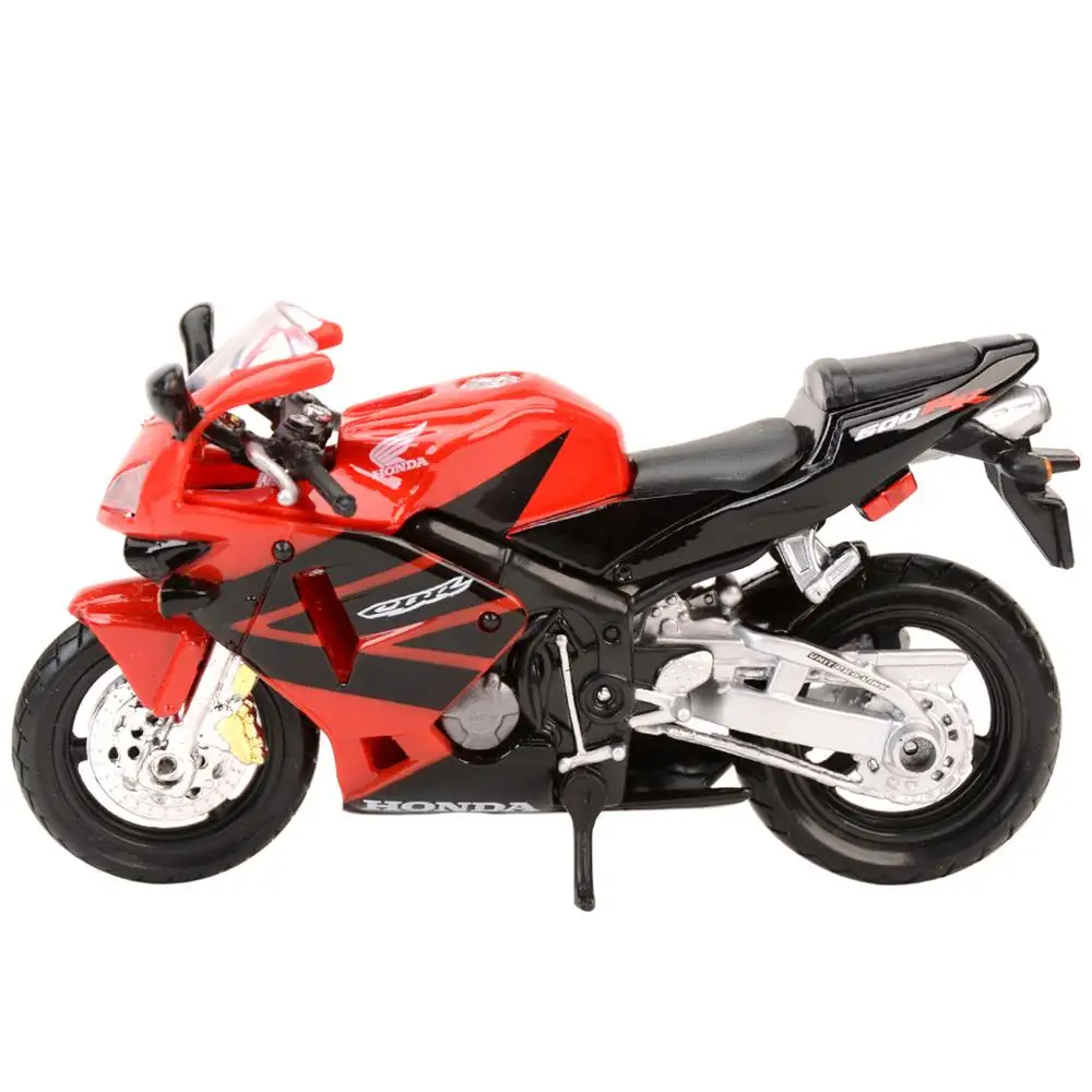 Название: Honda CBR600RR Бренд: Maisto Размер: около 12 см x 4,5 см x 6,5 см Масштаб: 1:18 Материал: литой металл с пластиковыми деталями Упаковка: полноцветная коробка с окошком Функция: ●Переднее колесо и руль могут поворачиваться из стороны в сторону ●Подвижная подставка ●Пружинная задняя подвеска ● Свободные колеса