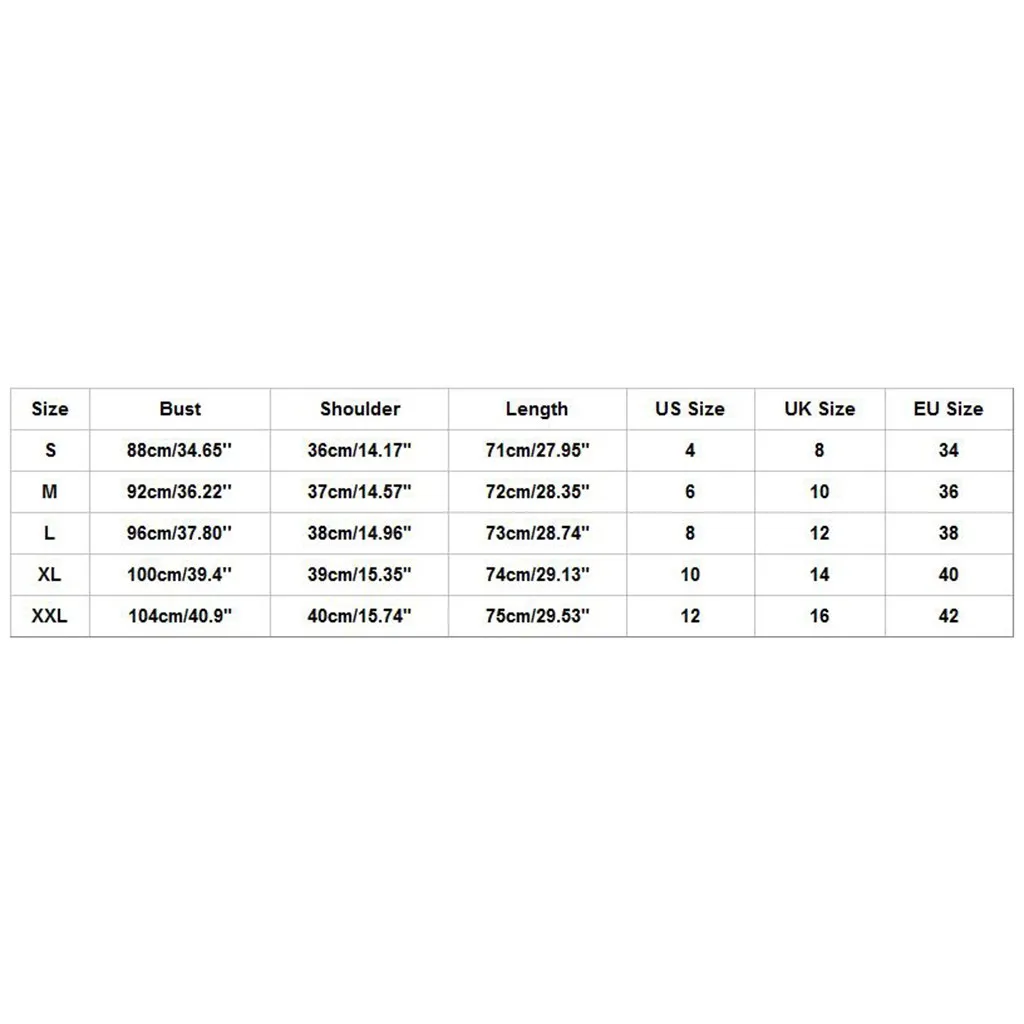 | Size | Bust | Shoulder | Length | US Size | UK Size | EU Size |
