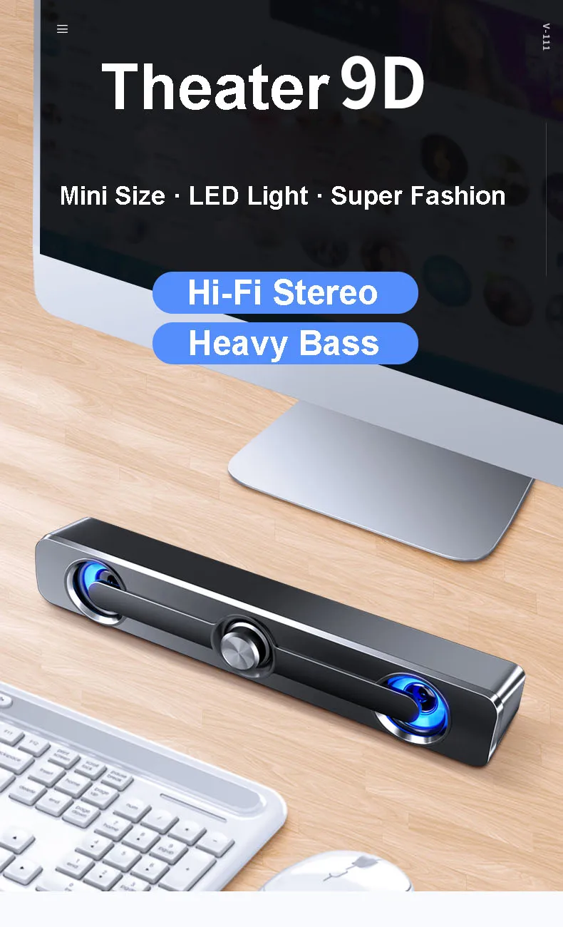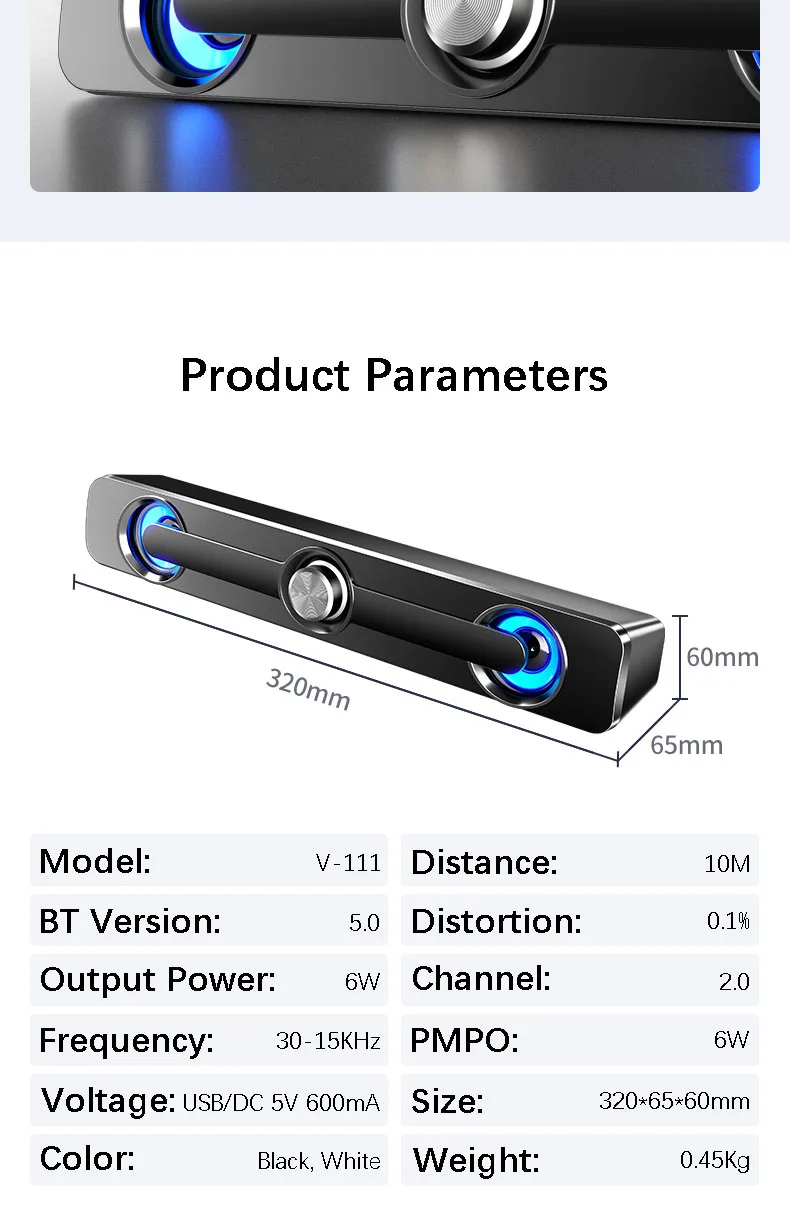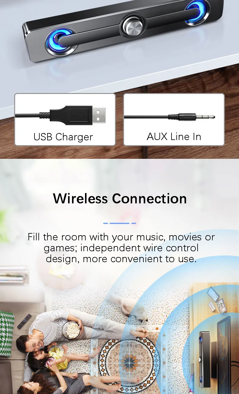 Hello, friends! welcome to our shop I believe our products will bring you satisfaction and surprises Product description: This is a stylish speaker with powerful functions, strong penetration and good sound quality, (the quality is guaranteed) Applicable occasions: outdoor, family, party, birthday party, travel, sports (variety of styles) TV Sound Bar With built-in subwoofer provides powerful bass, enhance home-audio systems, great for small environments, suit for Bluetooth TVs including Samsung, Vizio, TCL, LG, Sharp, Philips, Sony, Xiaomi and many more TVs and phones. 2.1 Channel Soundbar With 2x 3w full-range speakers , output surround sound for all your movies, music and TV shows, Enjoy 97 dB of room filling, crystal clear sound with less than 1% total harmonic distortion Wired and Wireless Support wireless Bluetooth 5.0, supply optical cable and AUX cable for wired connection USB Powered Powered by USB cable, no worry anout out of power. Specification- Material: ABS