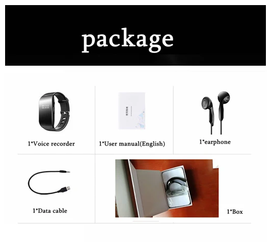 Voice recorde*1 Earphone*1 Data cable*1 User Manual(English)*1 Inner packing box*1