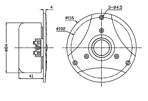 [Speaker parameters] Panel diameter 116mm, diagonal screw hole distance 102mm, speaker opening diameter>=88-95mm, total height 45mm, magnet diameter 84mm, magnet thickness 41mm, please be optimistic about the size before placing an order! Impedance is 5 ohms (DC resistance is about 4.6 ohms), rated power is 15W, peak power is 30W, sensitivity is 92dB, resonance frequency is 800HZ, recommended frequency point is >2500Hz, voice coil diameter is 25mm, and net weight is about 1KG.