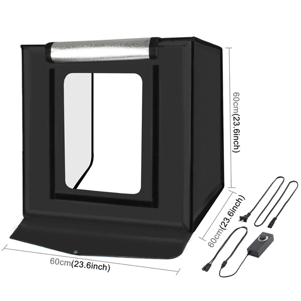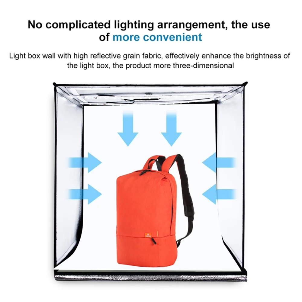 3. 2 светодиодные ленты: встроенные 2 высококачественные светодиодные ленты, фотостудия помогает вам делать высококачественные фотографии, 60 Вт 5500 к светодиодные лампы могут смягчить и отражать свет, устраняйте блики и пятна для идеальной съемки, вы можете регулировать яркость с помощью источника питания в соответствии с различными элементами, которые вы снимаете.