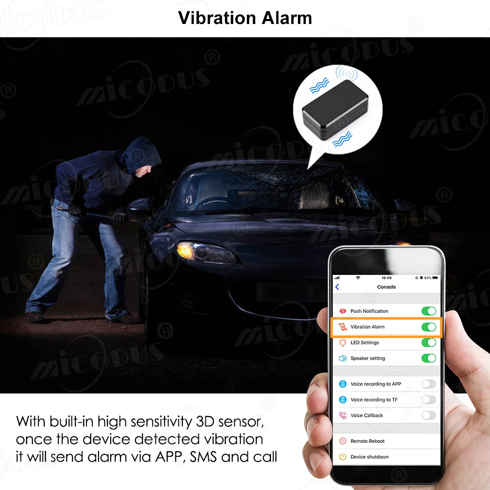 С встроенным 3D сенсором высокой чувствительности, как только устройство обнаружит вибрацию. Он отправит будильник через приложение, SMS и вызов.