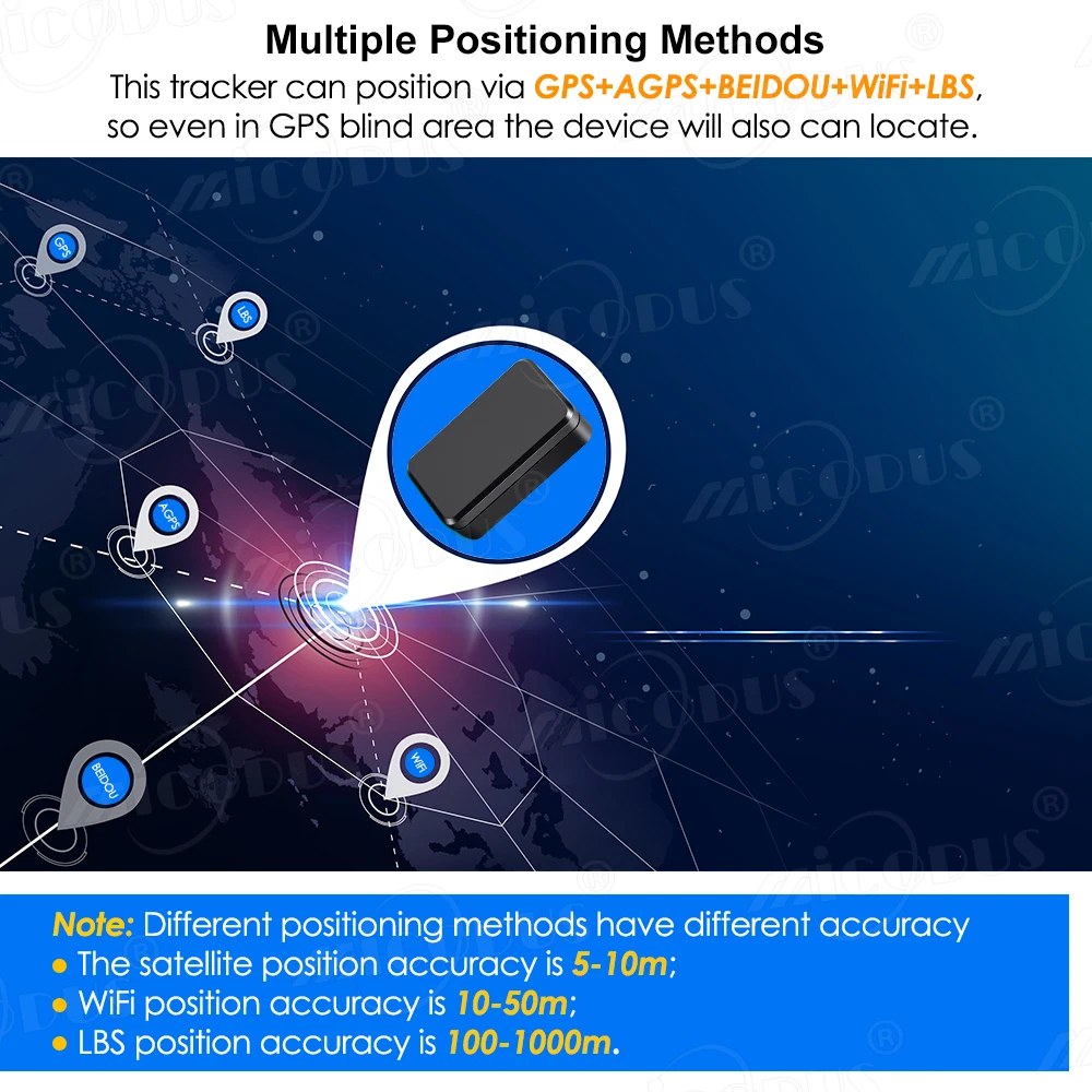 Этот трекер может позиционироваться с помощью GPS + BEIDOU + WiFi + LBS. Так что даже в слепой области GPS устройство также может найти.
