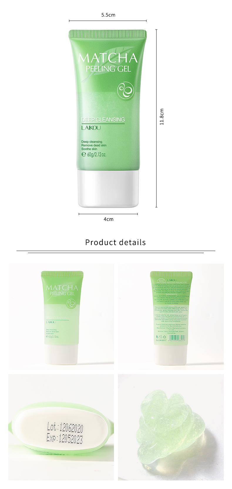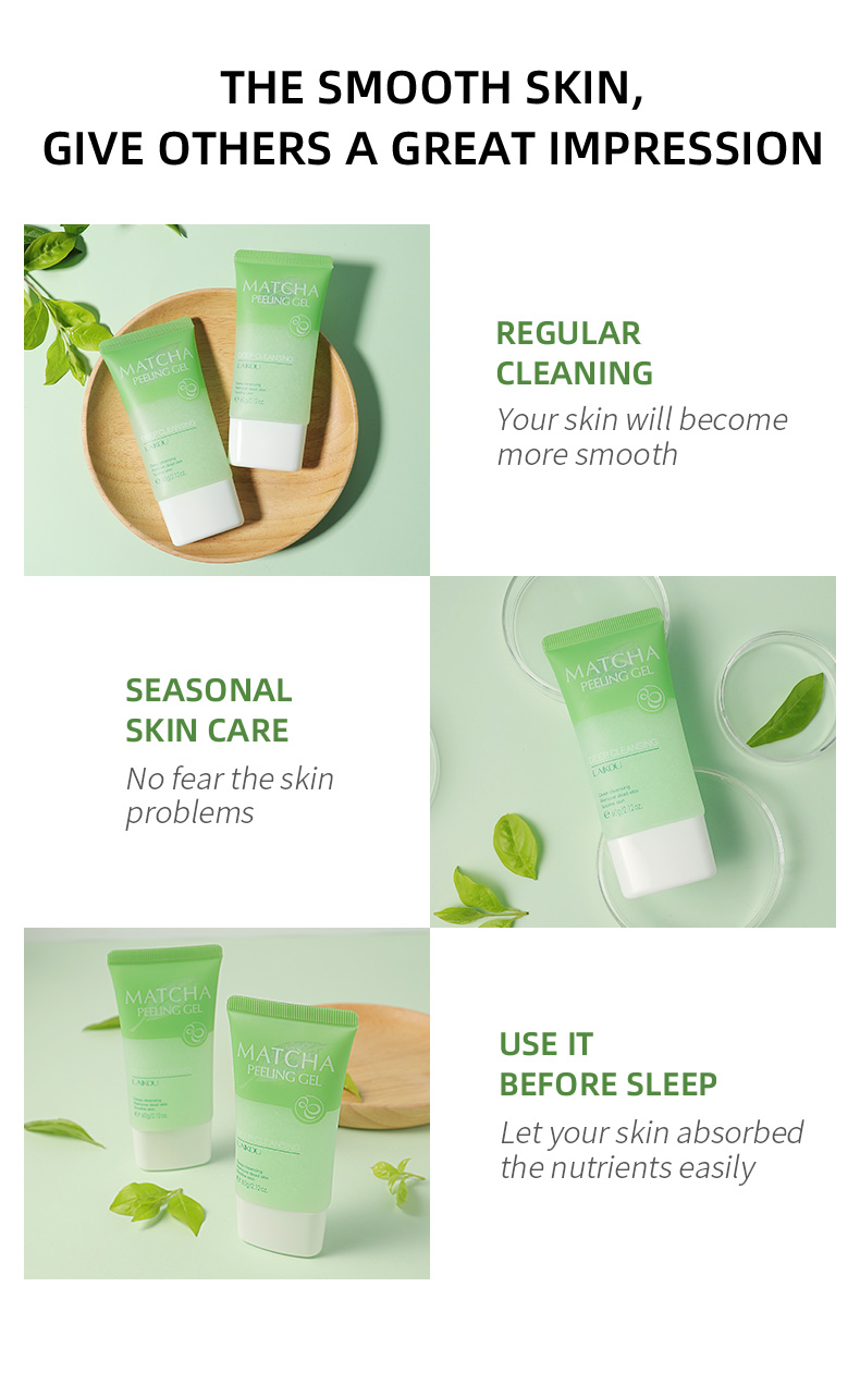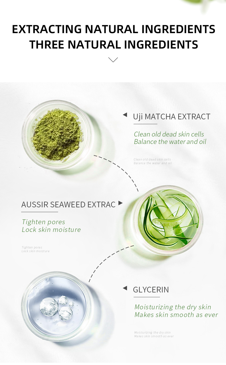 Содержит экстракт листьев камелии Синенсис и глицей, гель-пилинг матча может мягко удалить тусклый и яркий тон кожи. Благодаря функциям расслабления кожи, устранения грязи, которая вызывает акне и угри, а также уменьшения акне, ваша кожа гладкая и нежная, и дайте ей снова дышать.
