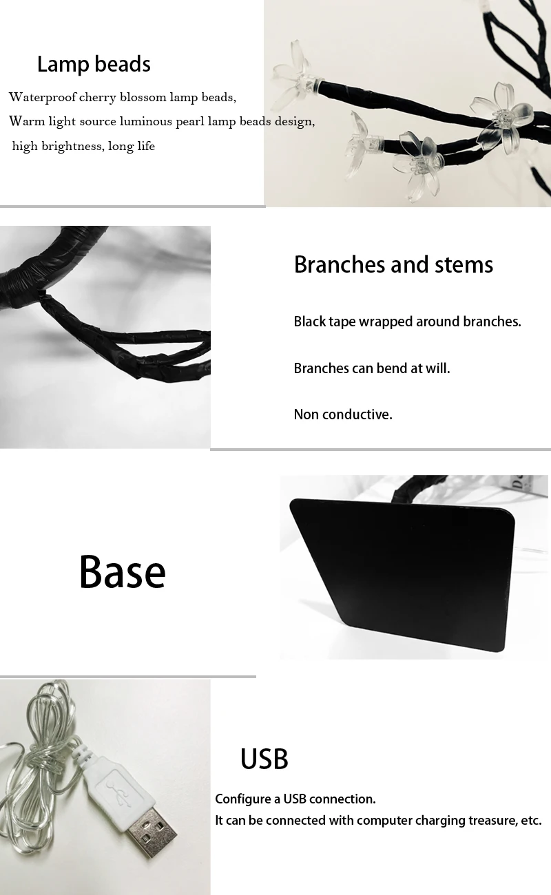 Особенности: 1. Стильный дизайн бонсай, идеально подходит для украшения дома на столе или столе. Светильник с рождественской елкой, украшенный множеством теплое белое светодиодное освещение светильник s. Яркие цветы, коричневый стебель и ветви, более привлекательные, чем настоящие растения бонсай. 2. Регулируемый: удовлетворить потребности DIY с регулируемыми ветками. Вы можете согнуть ветви и дерево в любую форму или более естественную форму дерева, как вам нравится. 3. Внутренний/наружный: безопасность является первой и важной. Стабильная Базовая подставка, оснащенная usb-разъемом, может использоваться как внутри, так и снаружи. 4. Применение: идеально подходит для дома, спальни, гостиной, балкона, окна балкона, офисной комнаты, детской комнаты, ресторана, веранды, павильона, полки, для рождества, Нового года, вечеринок, день рождения, свадебная церемония, вечерние украшения. Описание: Материал: пластик + железо + медная проволока Название товара: USB лампа вишневого дерева Источник питания: USB dc5V Высота: 40-45 см Кабель: 90-100 см Диаметр основания: 12x12 см Количество СВЕТОДИОДНЫЙ светильник: 24/36/48 шт Цвет светодиодный светильник: теплый белый Световой поток: 1000 (лм) Посылка включает в себя: 1x Рождественское приветствие Вишневое дерево светильник