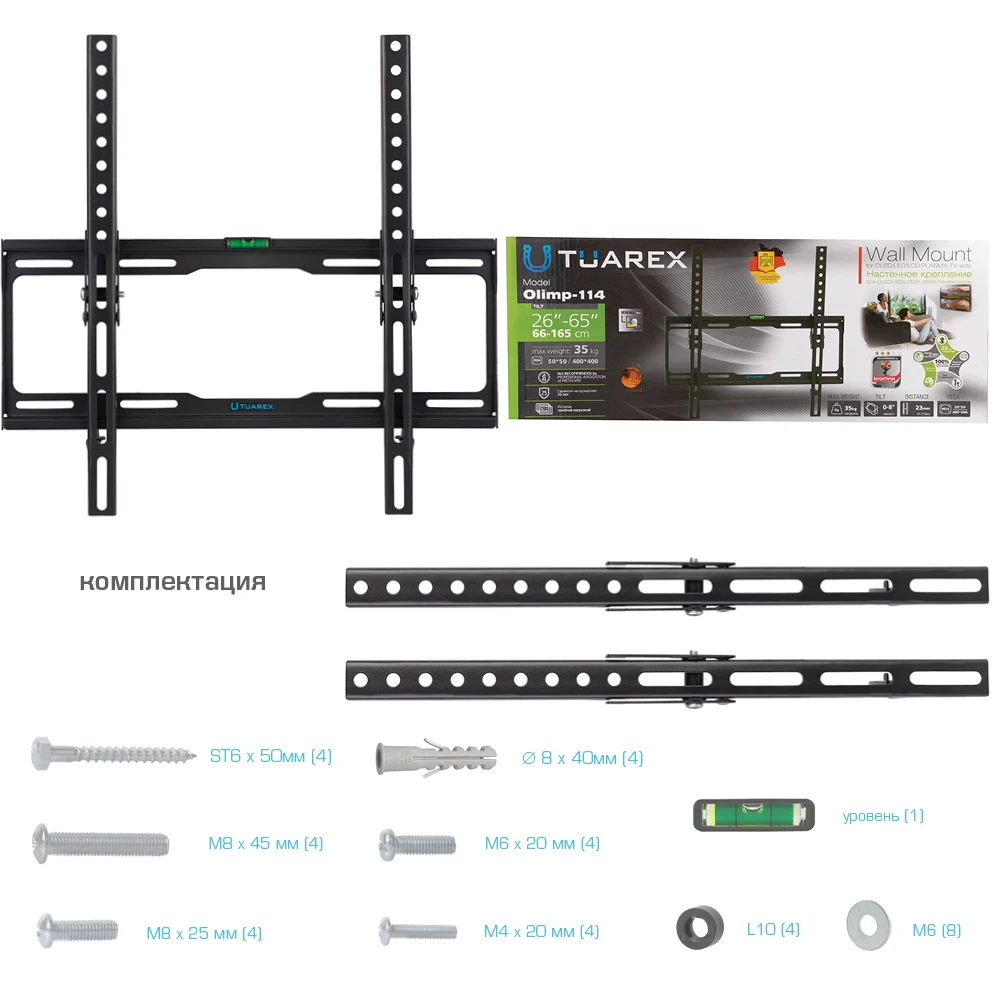 Удобный настенный кронштейн для LED/LCD телевизоров TUAREX OLIMP-114 BLACK надёжно удержит экран размером от 26"-65" дюйма и весом до 35 килограммов. Простая и интуитивно понятная конструкция настенного кронштейна для LED/LCD телевизоров TUAREX OLIMP-114 BLACK идеально подойдет для самостоятельного монтажа.Наклонная регулировка настенного кронштейна позволит наклонять экран наклонять вверх и вниз на 0-8°.Кронштейн подходит для большинства телевизоров популярных брендов, среди которых Samsung, LG, Sony, Panasonic, Sharp, Toshiba, KIVI, Xiaomi Mi, SUPRA, Hyundai, Erisson, Tcl, Asano, Horizont, JVC, Thomson, HARTENS, Skyworth, HAIER, BBK, AVEL, Витязь, Веко, BQ, DEXP, OZON, SkyLine, Pioneer, Philips, Rolsen, Harper, Hisense, Hitachi, Polarline, Prestigio и других.Крепёжные отверстия настенного кронштейна для LED/LCD телевизоров TUAREX OLIMP-114 BLACK изготовлены по международному универсальному стандарту VESA.В комплектацию настенного кронштейна для LED/LCD телевизоров TUAREX OLIMP-114 BLACK входят необходимые для монтажа материалы.Вся продукция обеспечивается гарантийными обязательствами. 18 лет гарантии на все сварные и механические соединения позволит наслаждаться конструкцией долгий срок. Во время эксплуатации изделие демонстрирует поразительную износостойкость и безотказность, ведь все технико-эксплуатационные характеристики кронштейнов подвергаются скрупулезному контролю непосредственно в процессе производства.