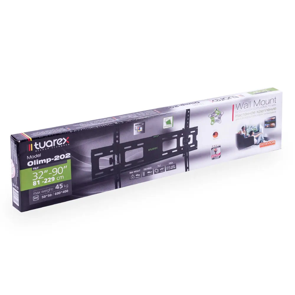 Удобный настенный кронштейн для LED/LCD телевизоров TUAREX OLIMP-202 BLACK надёжно удержит экран размером от 32"-90" дюйма и весом до 45 килограммов. Простая и интуитивно понятная конструкция настенного кронштейна для LED/LCD телевизоров TUAREX OLIMP-202 BLACK идеально подойдет для самостоятельного монтажа.Наклонная регулировка настенного кронштейна позволит наклонять экран наклонять вверх и вниз на ±15°.Кронштейн подходит для большинства телевизоров популярных брендов, среди которых Samsung, LG, Sony, Panasonic, Sharp, Toshiba, KIVI, Xiaomi Mi, SUPRA, Hyundai, Erisson, Tcl, Asano, Horizont, JVC, Thomson, HARTENS, Skyworth, HAIER, BBK, AVEL, Витязь, Веко, BQ, DEXP, OZON, SkyLine, Pioneer, Philips, Rolsen, Harper, Hisense, Hitachi, Polarline, Prestigio и других.Крепёжные отверстия настенного кронштейна для LED/LCD телевизоров TUAREX OLIMP-202 BLACK изготовлены по международному универсальному стандарту VESA.В комплектацию настенного кронштейна для LED/LCD телевизоров TUAREX OLIMP-202 BLACK входят необходимые для монтажа материалы.Вся продукция обеспечивается гарантийными обязательствами. 18 лет гарантии на все сварные и механические соединения позволит наслаждаться конструкцией долгий срок. Во время эксплуатации изделие демонстрирует поразительную износостойкость и безотказность, ведь все технико-эксплуатационные характеристики кронштейнов подвергаются скрупулезному контролю непосредственно в процессе производства.