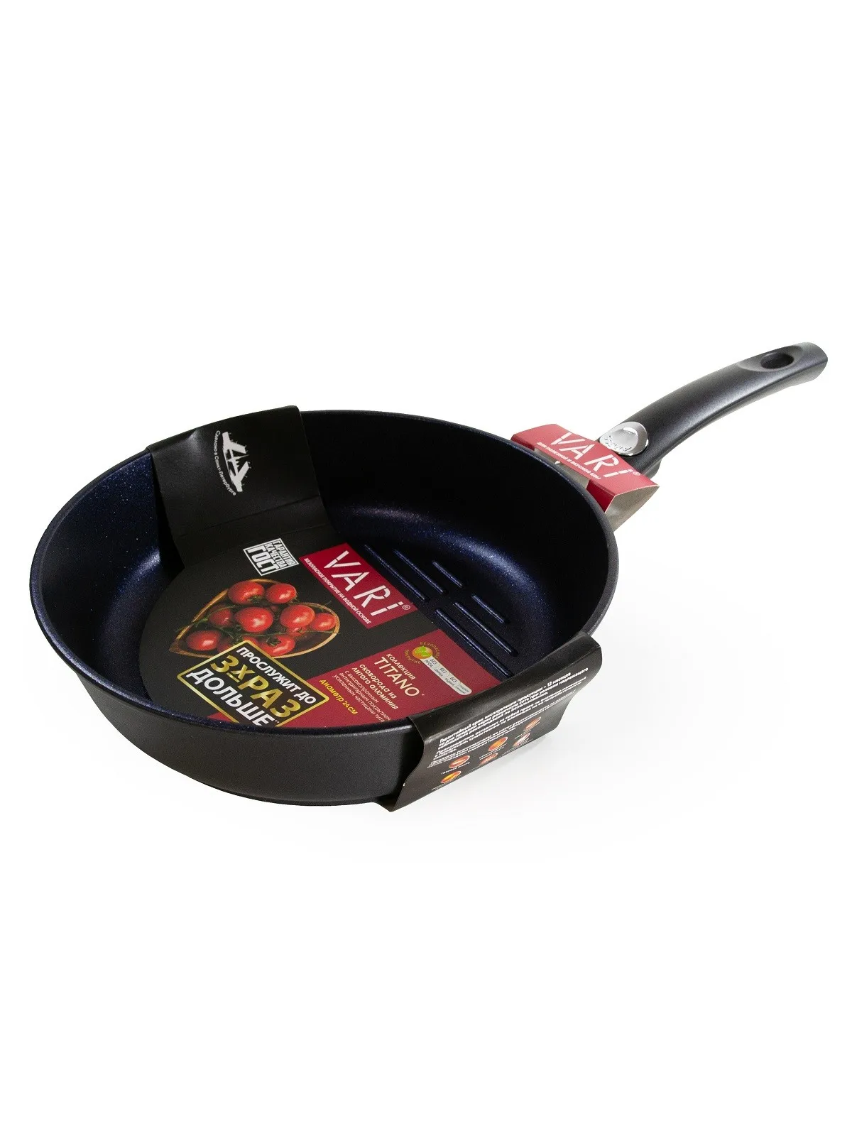 Надежная, как банковский сейф, сковорода серии «TITANO» с многослойным антипригарным покрытием QuanTanium обладает высокой отражающей способностью, что придает посуде яркость и привлекательность черного бриллианта. Готовьте блюда с минимальным количеством масла или даже без него — пища не будет пригорать. Антипригарная система QuanTanium от Whitford® позволяет нагреть посуду до более высокой температуры, что позволяет сразу зажарить продукты до хрустящей корочки, а потом потомить до готовности. Покрытие усилено частицами титана, которые обеспечивают высокую стойкость к царапинам и истиранию, даже при частом использовании. Покрытие не содержит PFOA (перфтороктановую кислоту), поэтому безопасно для человека. С наружной стороны сковороды нанесено жаростойкое силиконовое покрытие, которое предохраняет стеклокерамическую плиту от загрязнений. Толщина стенки 4,5 мм; дна 6 мм. После использования можно мыть в посудомоечной машине. Посуда торговой марки «VARI» отвечает всем требованиям качества, безопасности и долговечности.