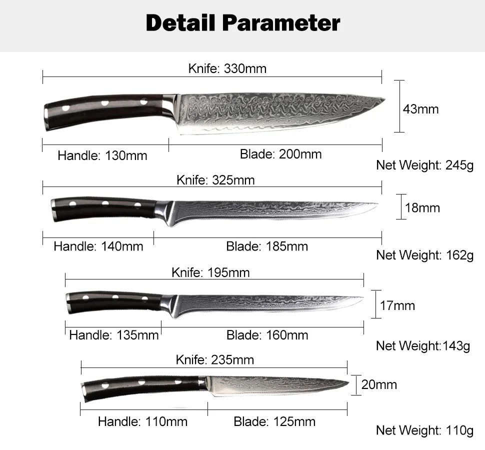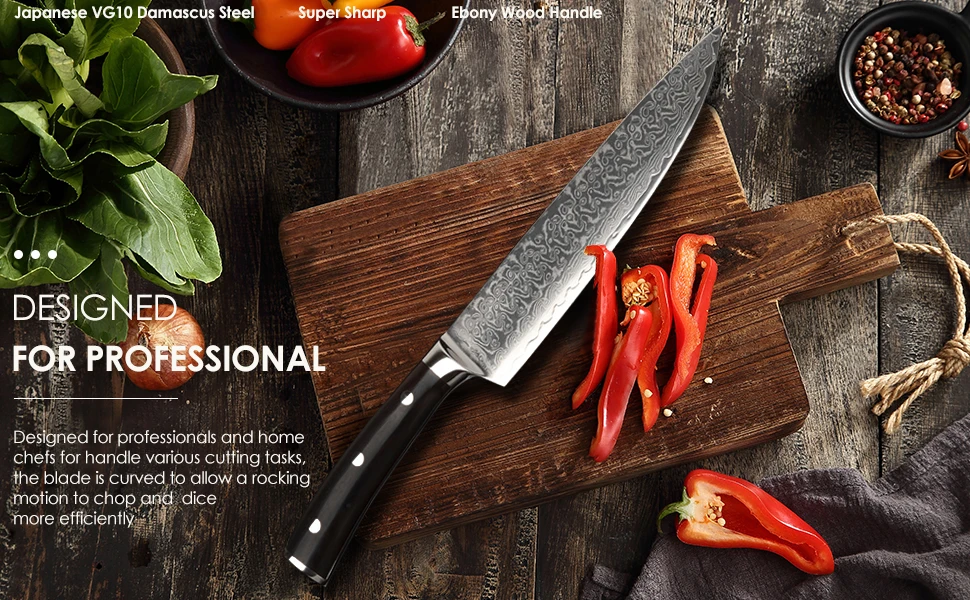 Продукт: 8 дюймов нож для шеф-повара 8 дюймов нож обвалочный нож, 6 дюймов нож обвалочный нож, 5-дюймовый НОЖ Материал лезвия: японский VG10 Дамасская сталь Материал ручки: эбеновая деревянная ручка, полная конструкция Твердость Rockwell C Масштаб: 58-60HRC Резкость: уровень силы резания с 6,0-8.0N международным стандартом Особенности --- Точность-кованая из VG10 Дамасская Высокоуглеродистая Сталь, импортированная из Японии при твердости 60 Rockwell --- Профессиональная Термическая обработка для оптимальной твердости и удержания кромок --- Полная конструкция tang для надежного баланса и обработки --- Эбеновая деревянная ручка с тройными заклепками, удобная для захвата и долговечная Внимание √ Перед первым использованием, пожалуйста, очистите нож и обратите внимание, чтобы избежать прямого контакта с краем лезвия. √ После стирки, чтобы сохранить срок службы вашего ножа, протрите их сразу же мягким чистым сухим полотенцем или бумажным полотенцем. √ Будьте осторожны при использовании и хранении. После каждого использования, пожалуйста, очистите и храните в держателе ножа или в другом безопасном месте. √ Пожалуйста, храните нож вдали от детей.