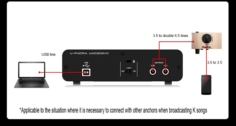 Интеллектуальный чип шумоподавленияЧип преобразования ADDA использует CIRRUS LOGIC CS4272. Производительность AD и DA очень хорошо сбалансирована, и динамика составляет до 114дб, что соответствует уровню AKM AK4621. Это индекс текущих параметров среднего профессионального уровня звуковой карты около 2000-3000 юаней.UMC202HD обеспечивает частоту дискретизации до 192 кГц, и 2-х канальный усилитель микрофона может помочь в голос и музыкальный инструмент запись более высокой производительностью, это будет хороший выбор для аудио профессиональных пользователей.Сильная совместимостьУмный совместимый компьютер/AndroidСовместимая система:Windows 7/8/10 и Mac os 10,13/10,120Телефоны Android:Телефоны Android, поддерживающие только TYPE-C интерфейс передачи данныхМобильный телефон Apple:Не поддерживает отдельную запись, прямая трансляция может быть объединена с номером прямой трансляции