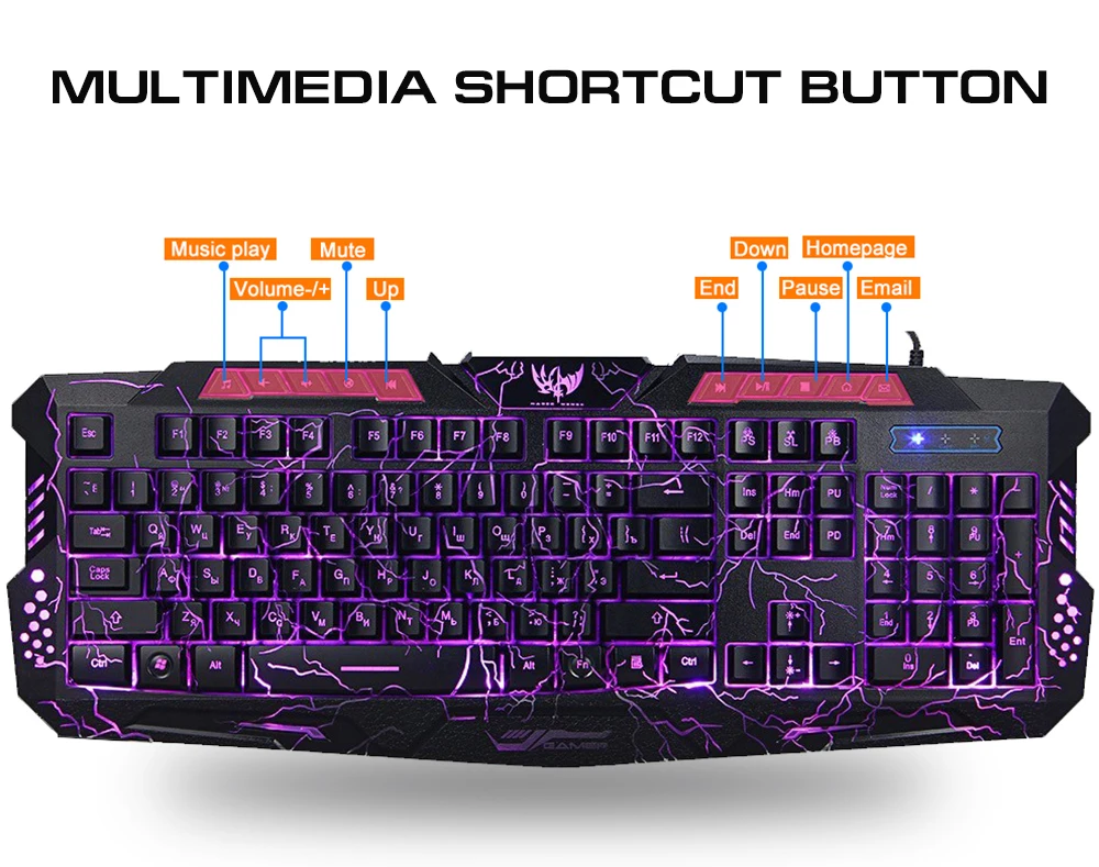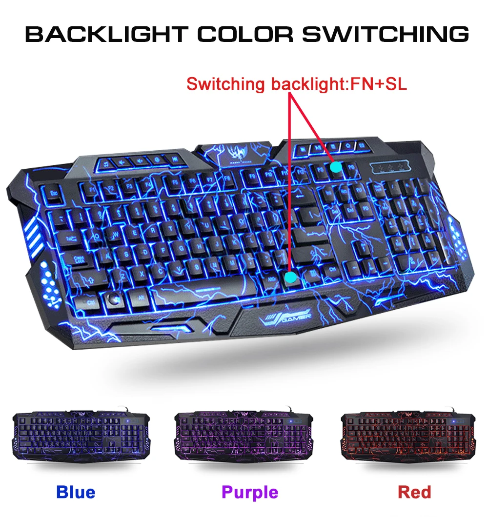 -- 3 регулируемых цвета подсветки, нажмите FN + SL, чтобы переключить цвет, синий, фиолетовый и красный