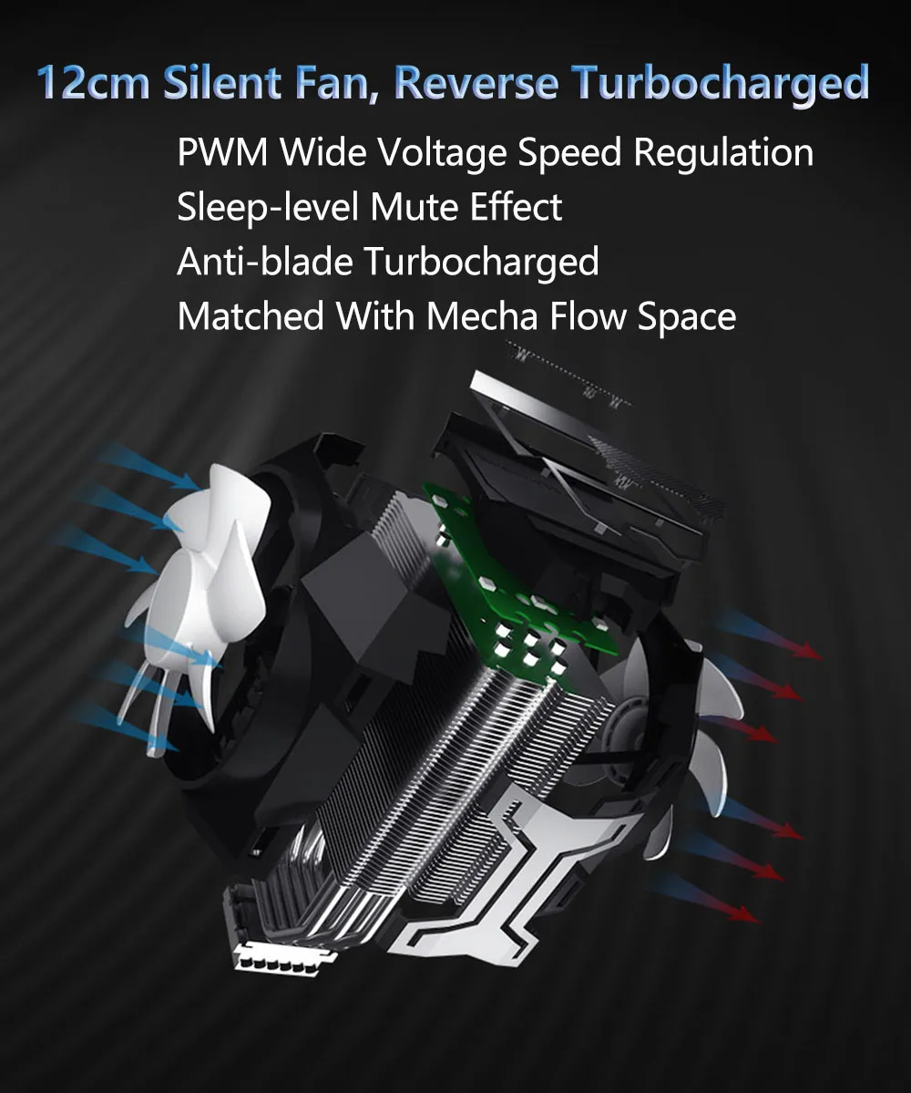 Двойной бесшумный вентилятор 120 мм, обратный турбонаддув, эффект отключения звука на уровне сна (30 дБА).