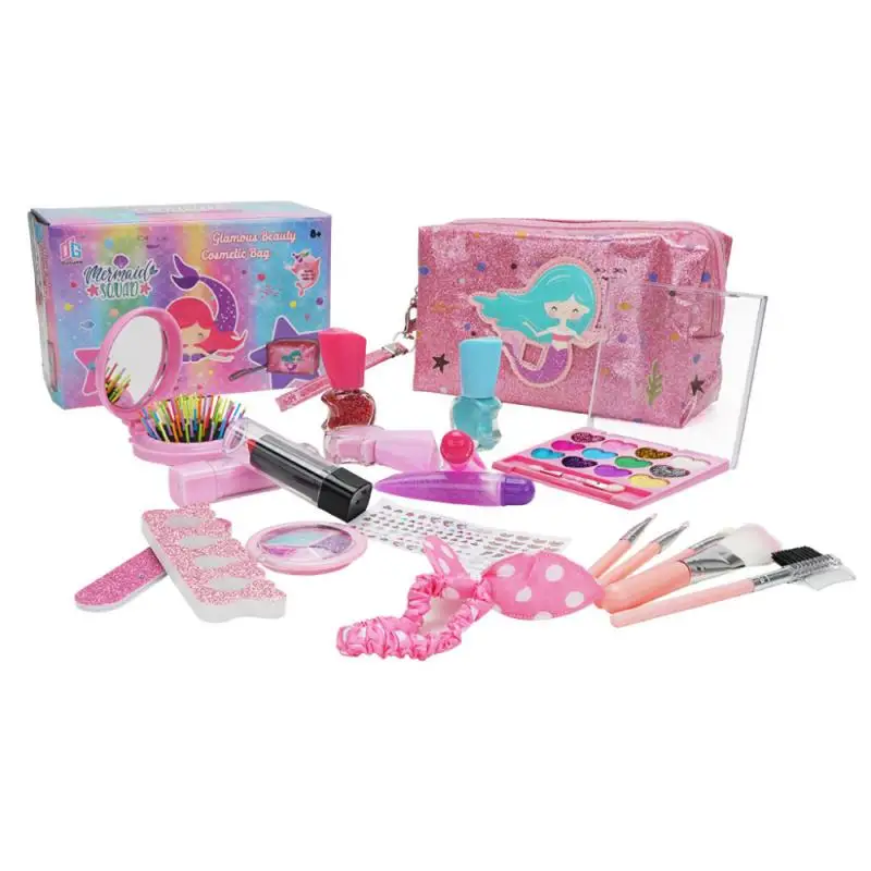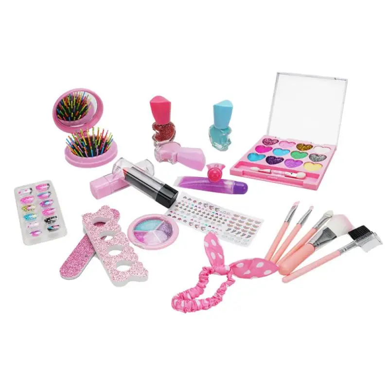 Package content: storage bag*1, nail polish*3, lipstick*2, lip gloss*2, 3-color eye shadow*1, glitter/blush/eye shadow box*1, nail file*1, finger holder*1, 2 in 1 comb /Mirror*1 Hair band*1, Nail sticker*1, Diamond sticker*1, Makeup brush*6
