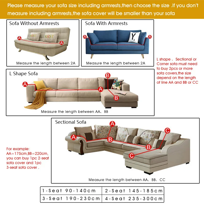 2. Пожалуйста, измерьте свой диван с подлокотником, затем выберите размер, если вы не измерите его, крышка дивана будет меньше, чем ваш диван.